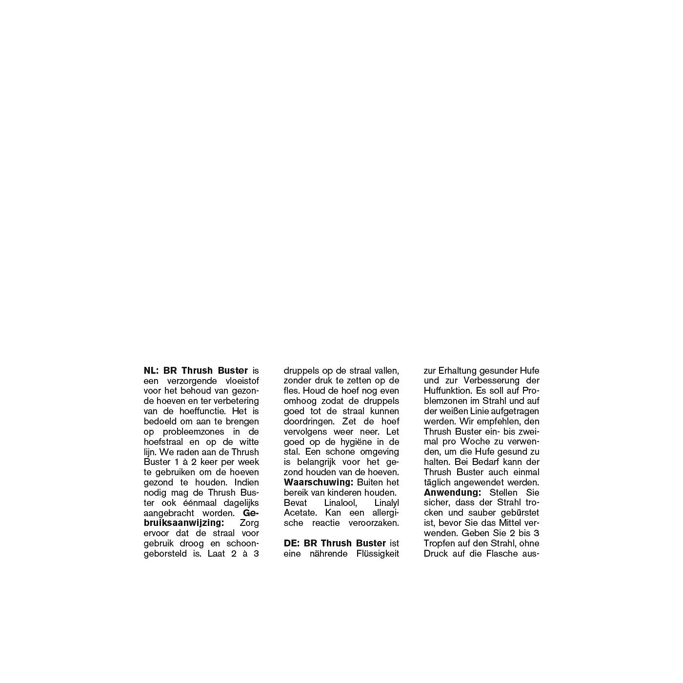 BR Thrush Buster on toitev hooldusvedelik, mis aitab sรคilitada kabjade tervist ja toetab nende loomulikku talitlust. Vedelik kantakse kabjakiilu ja kabjapiiri probleemsetele piirkondadele. Regulaarne kasutamine 1โ2 korda nรคdalas aitab hoida kabjad terved, vajadusel vรตib toodet kasutada ka igapรคevaselt.