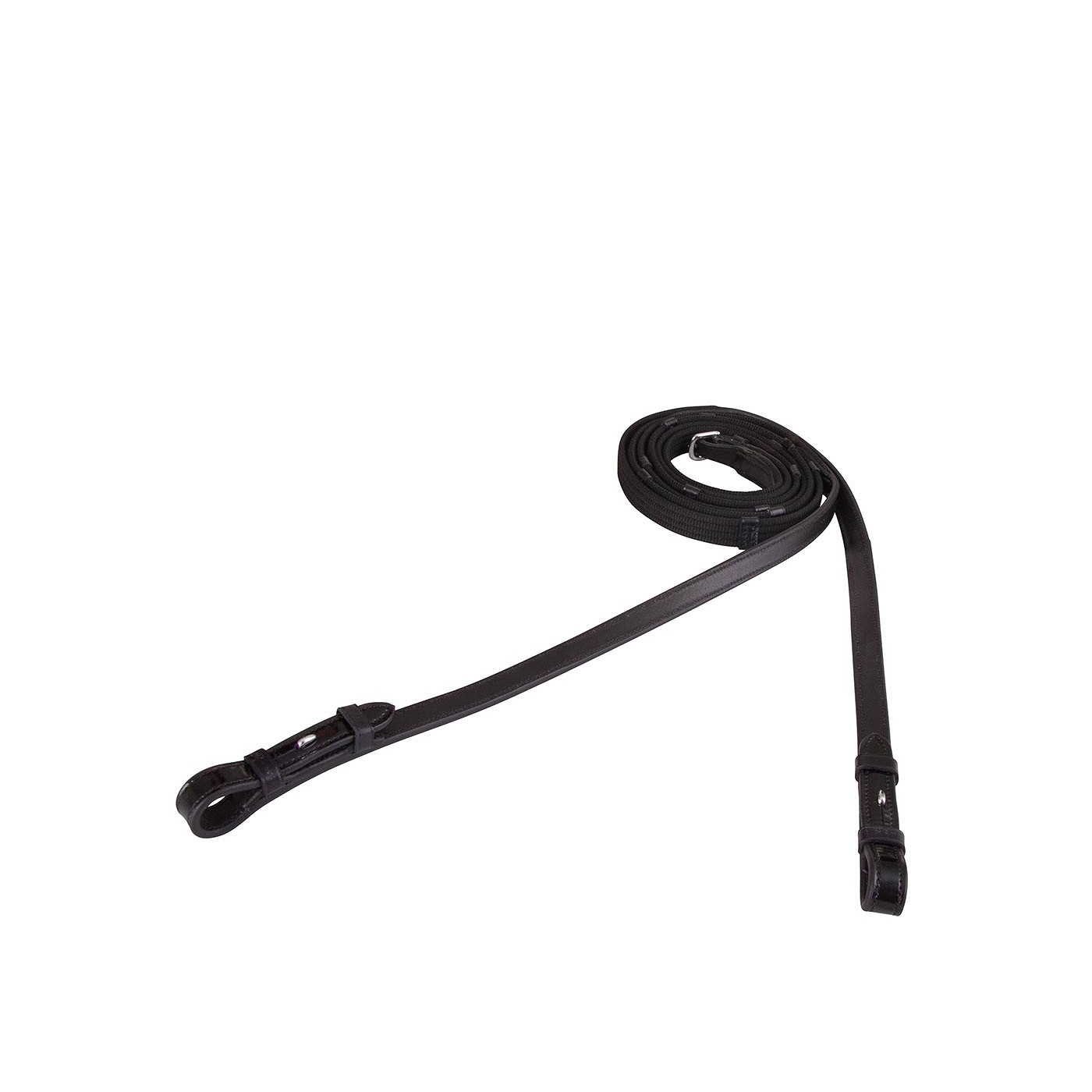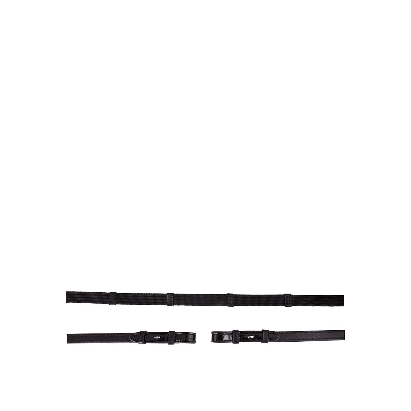 Web reins with patent leather ends, hand stops, hook stud billets and a round buckle, 19 mm.