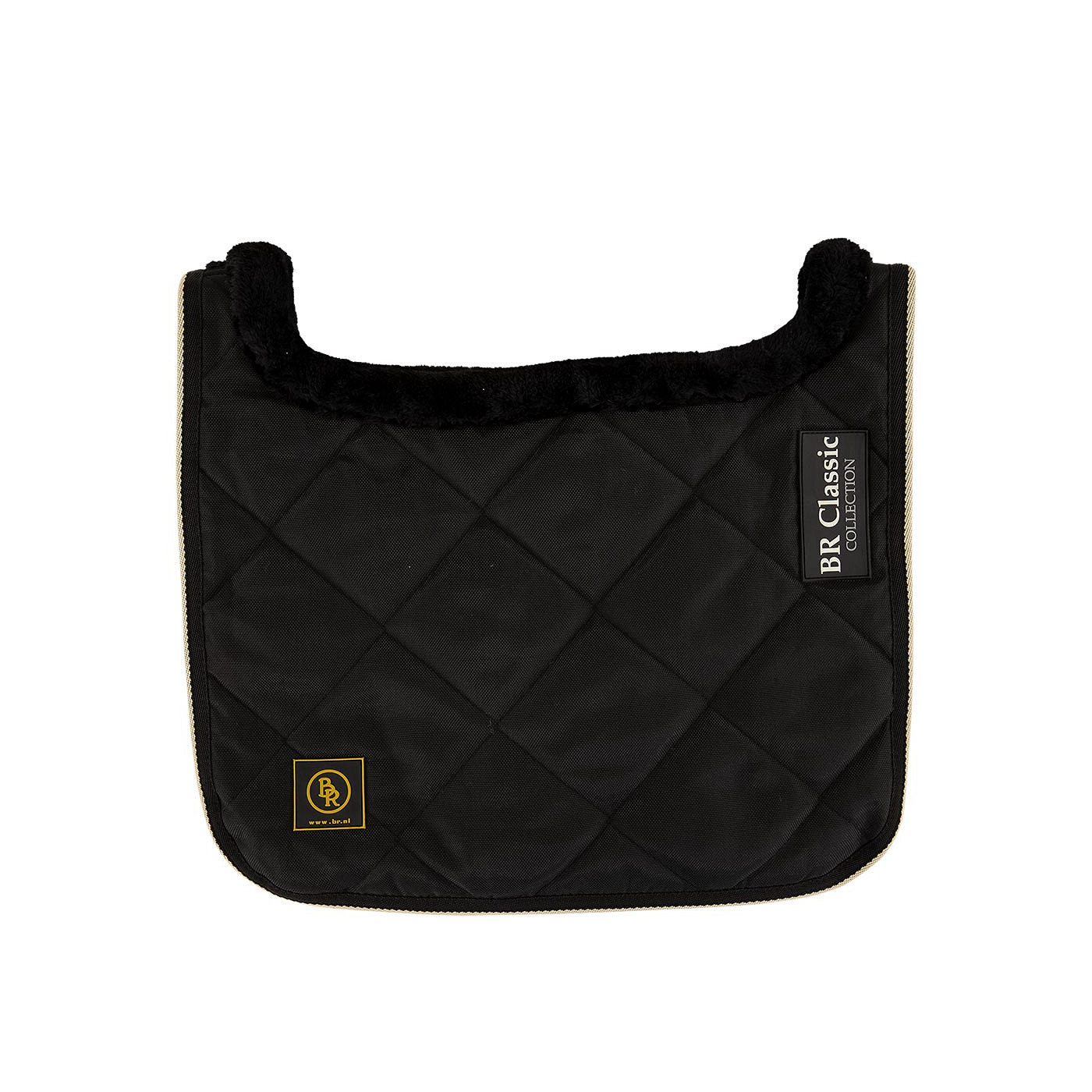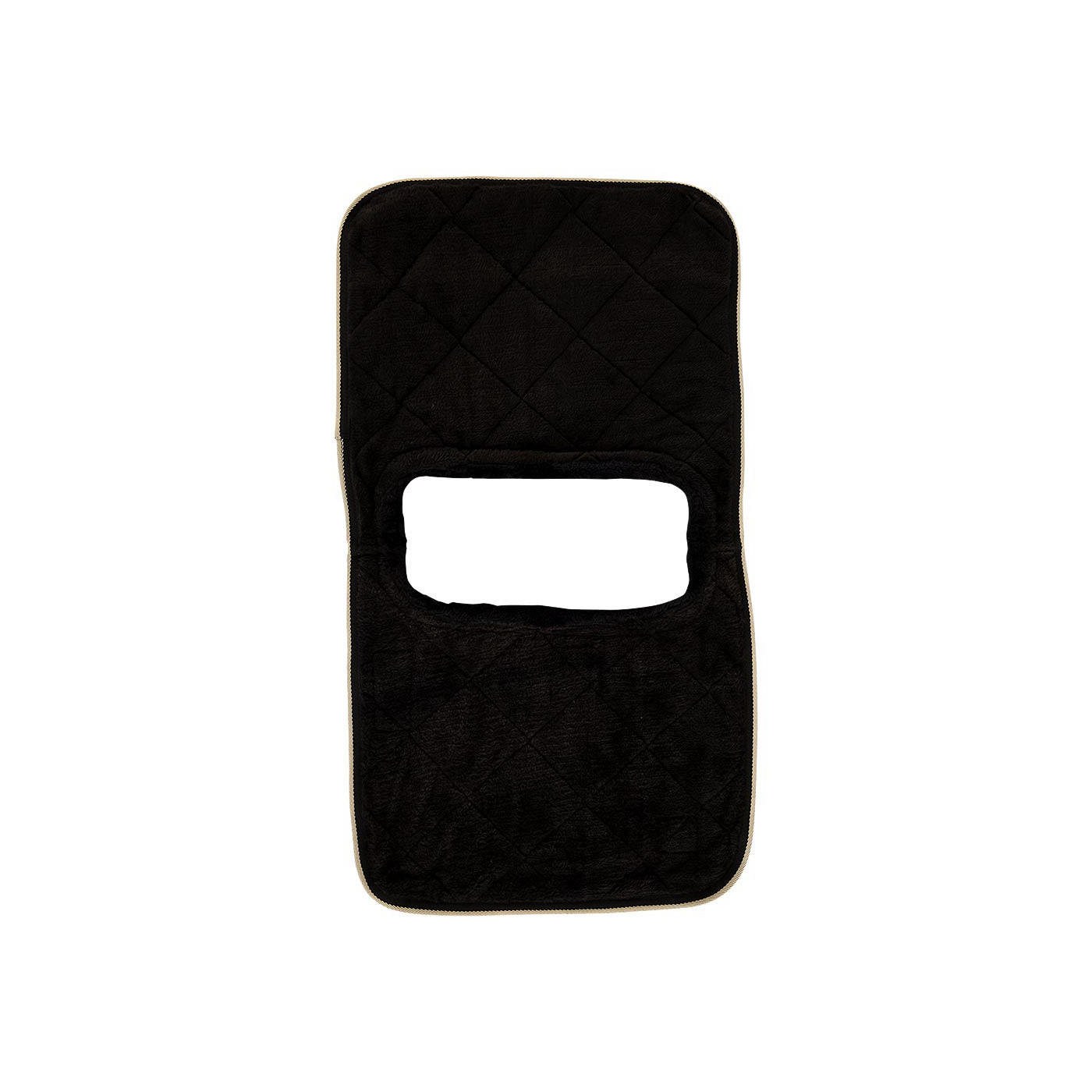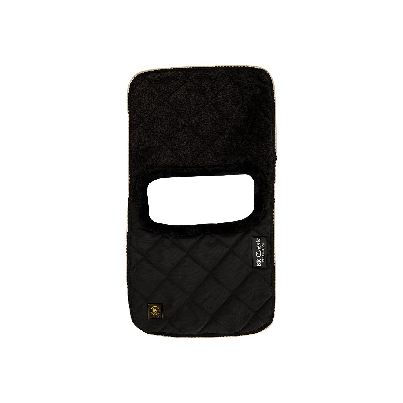 The protector consists of a front flap and a back flap. When using the protector, the back flap, which is made almost entirely of fake sealskin, should touch the horse’s skin. The front flap should be on the outside of the rug with the polyester side facing out. The soft collar and inside prevent the rug from rubbing against the horse’s skin.