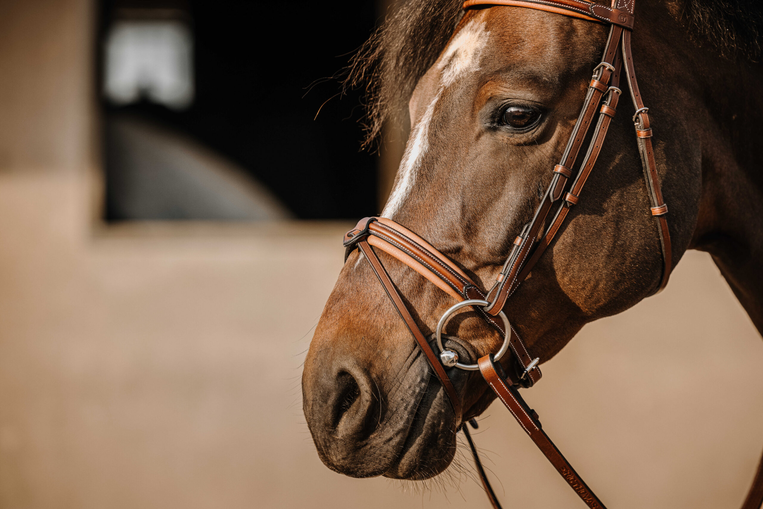 Bridle with an anatomical headpiece and padded noseband, combining luxury and robustness.