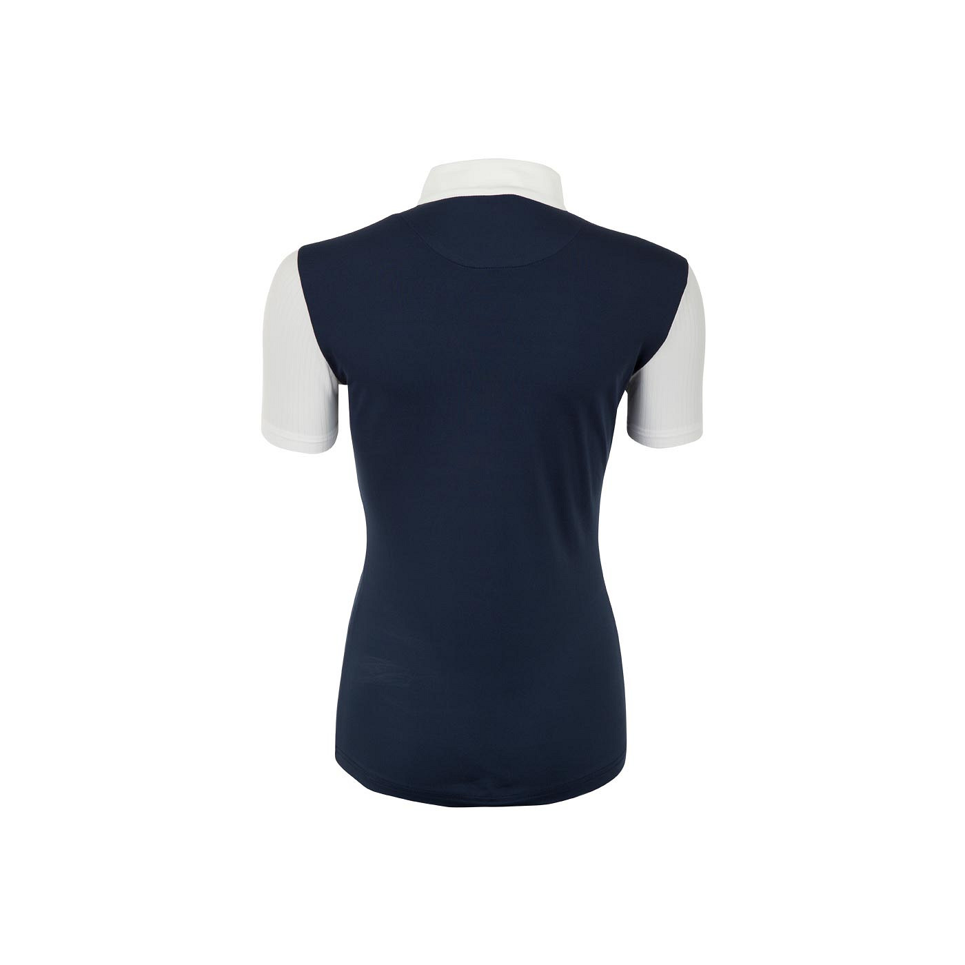 Quick drying, wicking competition shirt with an elegant and classy appearance, excellent for warmer competition days as well. The collar closes with a hidden zipper and is embellished with a silver BR logo made of silicone. The sleeves and part of the chest are made of a contrast fabric with a subtle lines. The left sleeve is decorated with a silver coloured metal BR logo. The competition shirt is available in white or white with a striking blue contrast colour.