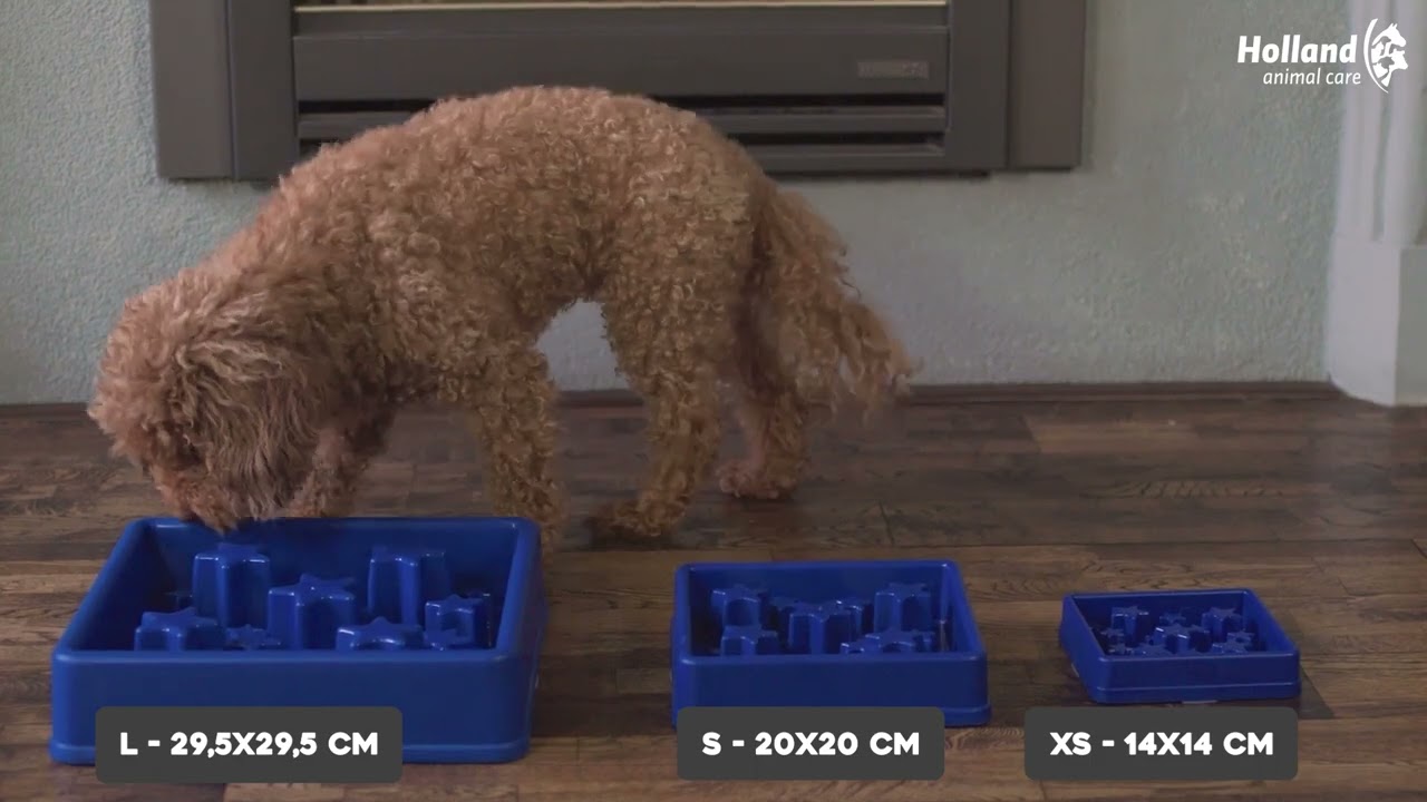 Use the anti-gobble bowl for daily portion(s) of dry food. Distribute the dry food evenly on the feeding bowl. This food bowl can also be used when giving snacks, so the dog or cat has to make an effort to get the treat.