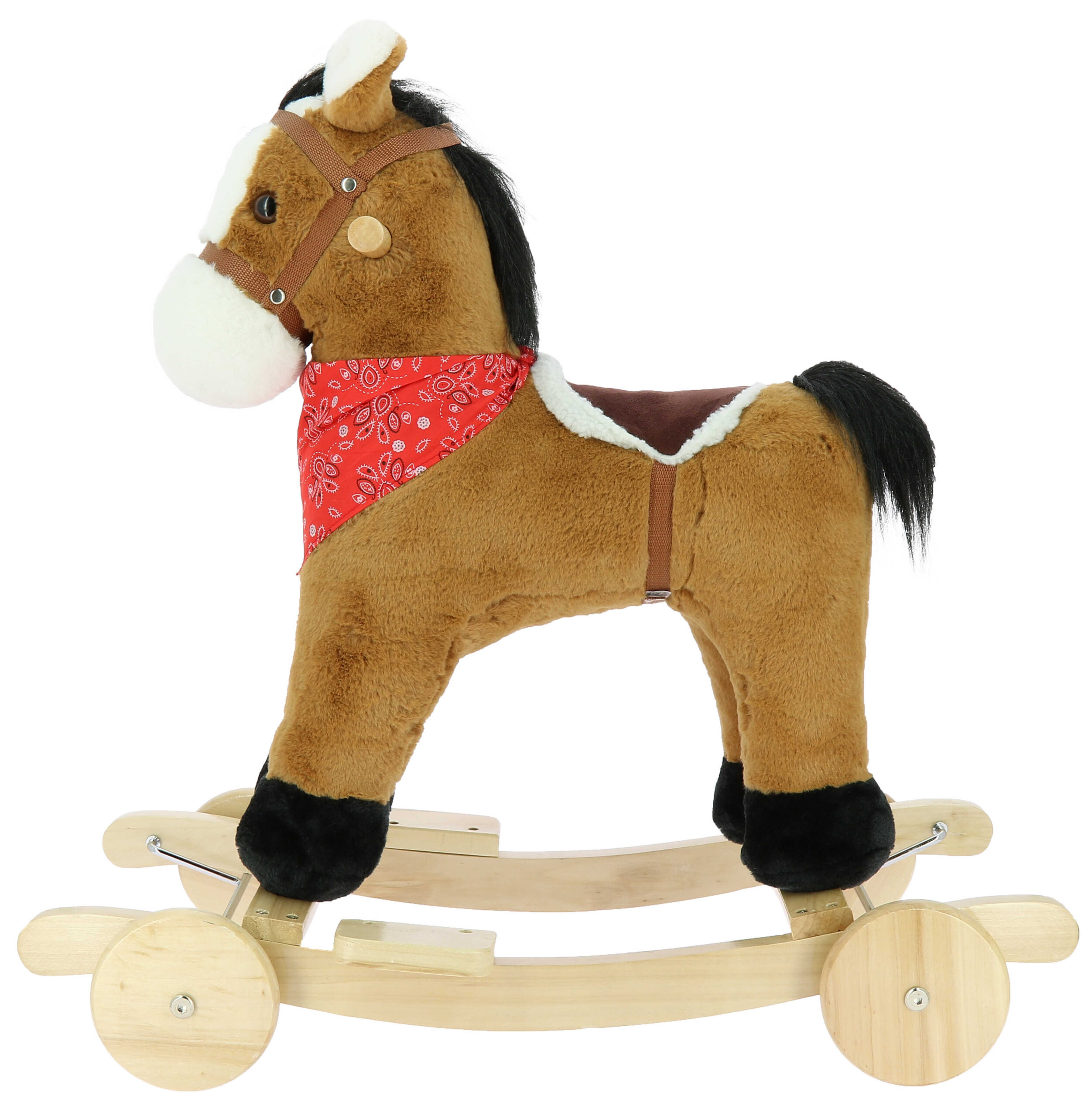 – Mounted on a rocking stand with removable wooden casters. The horse can be placed on all four wheels.