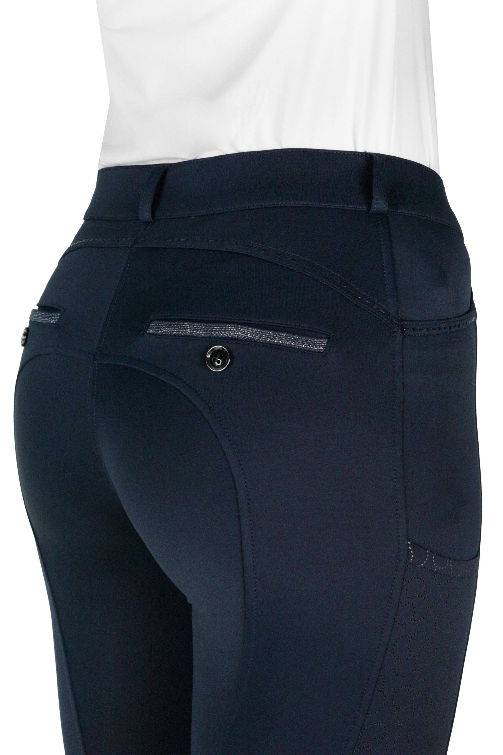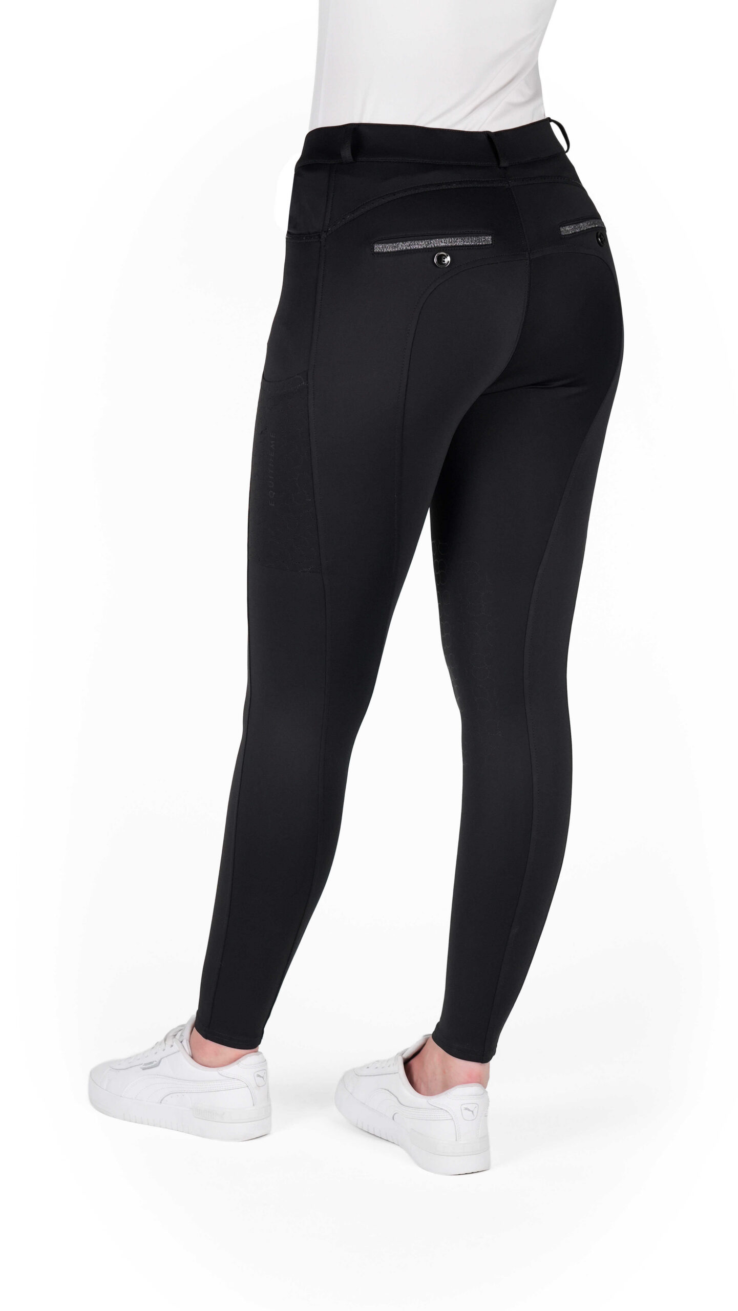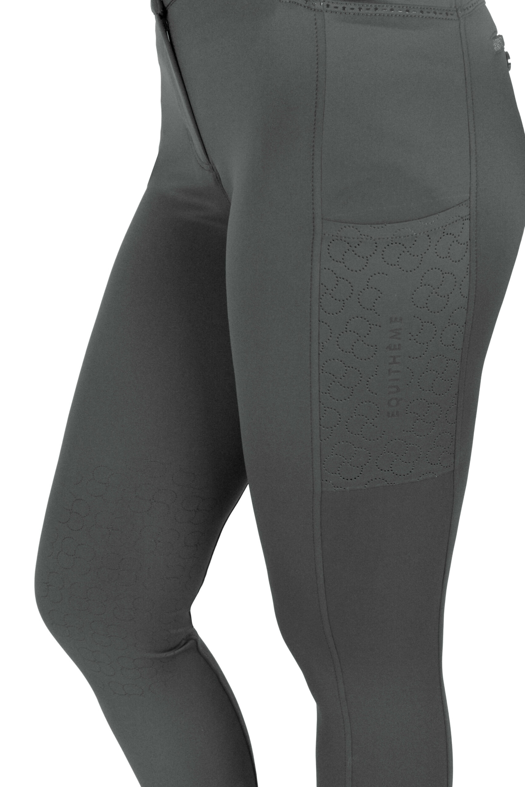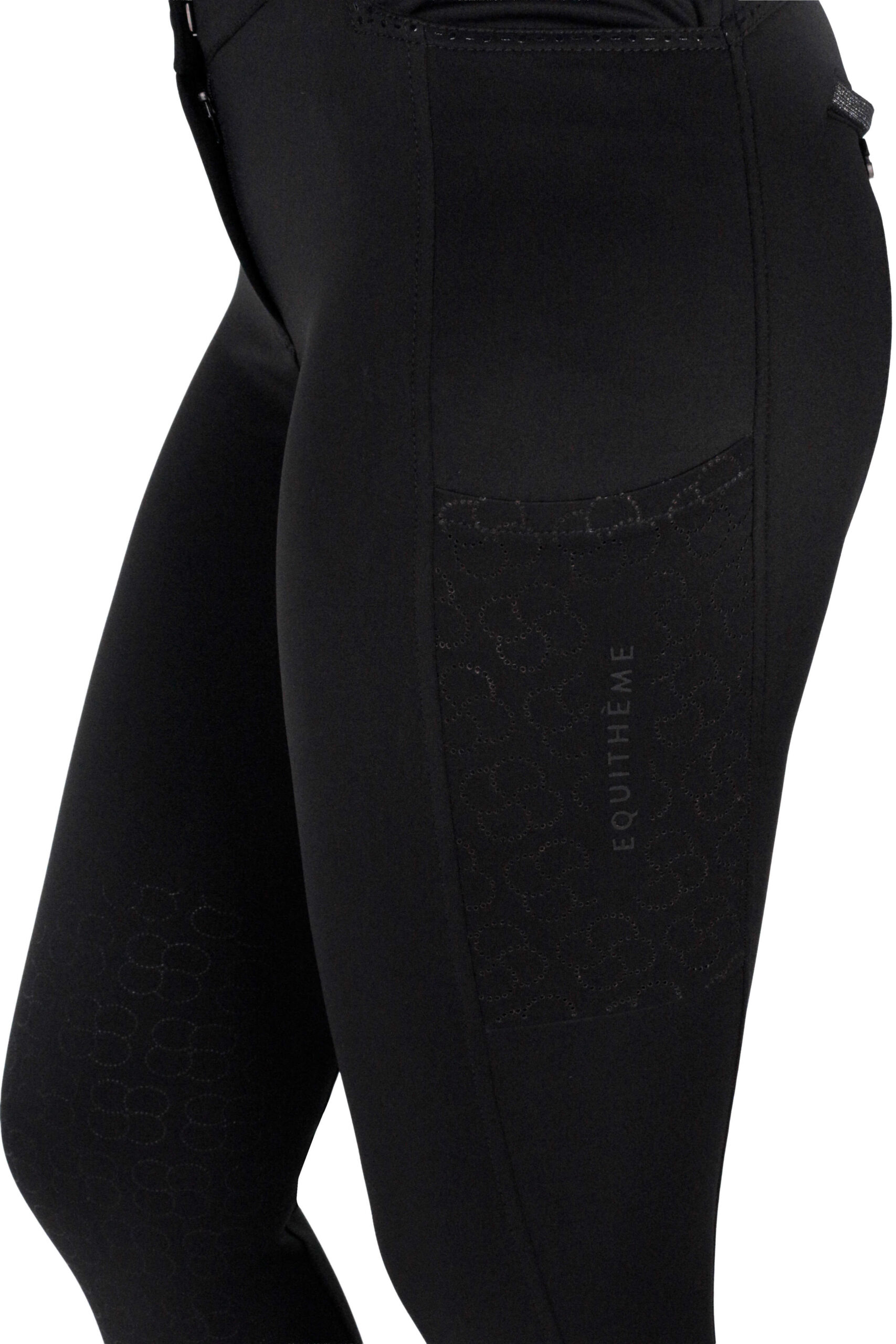 Breeches that offers comfort and style in the saddle.- Adjustment: Front closure with zip and button, with belt loops. – Stability in the saddle: Silicone knee patches for better grip. – Stretchy, breathable fabric with quick-drying properties. DETAILS: – Hand pockets and side pockets. – Fitted cut. – Decorative lurex stripe, decorative back flaps, and tonal Equithème silicone branding on the side. COMPOSITION: Main fabric: 87% polyester, 13% elastane.
