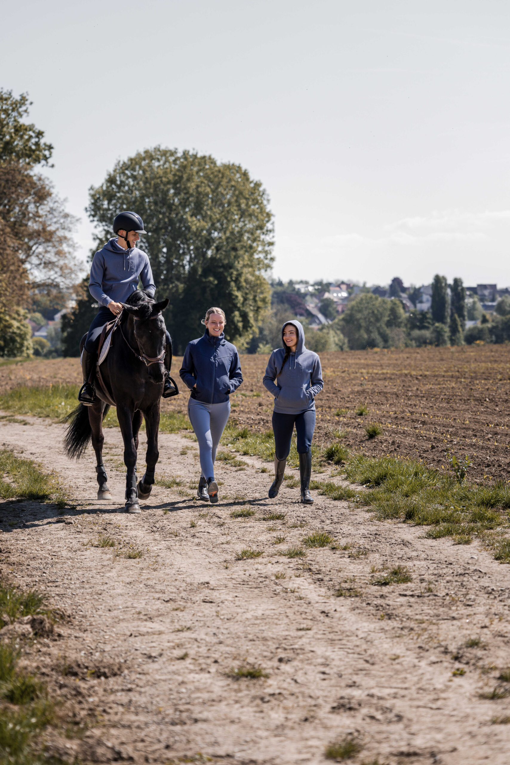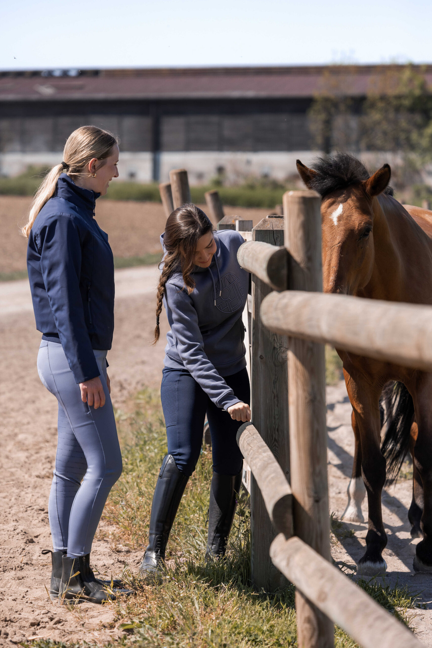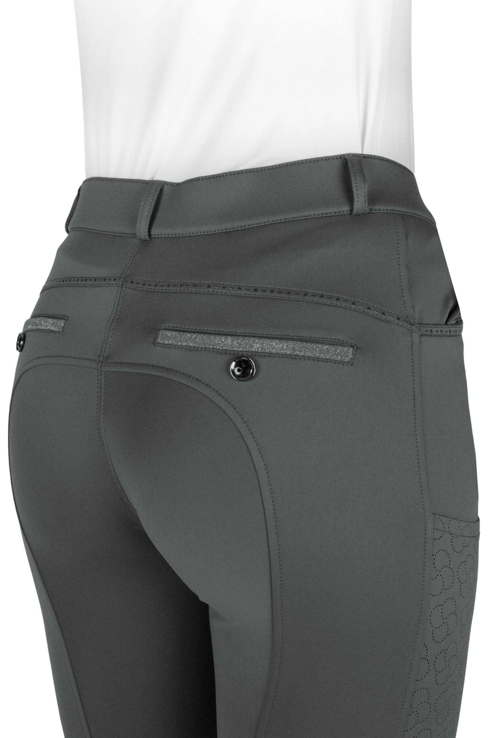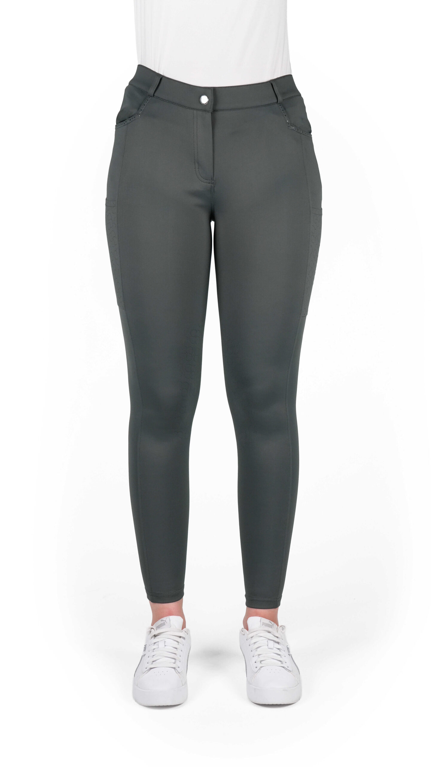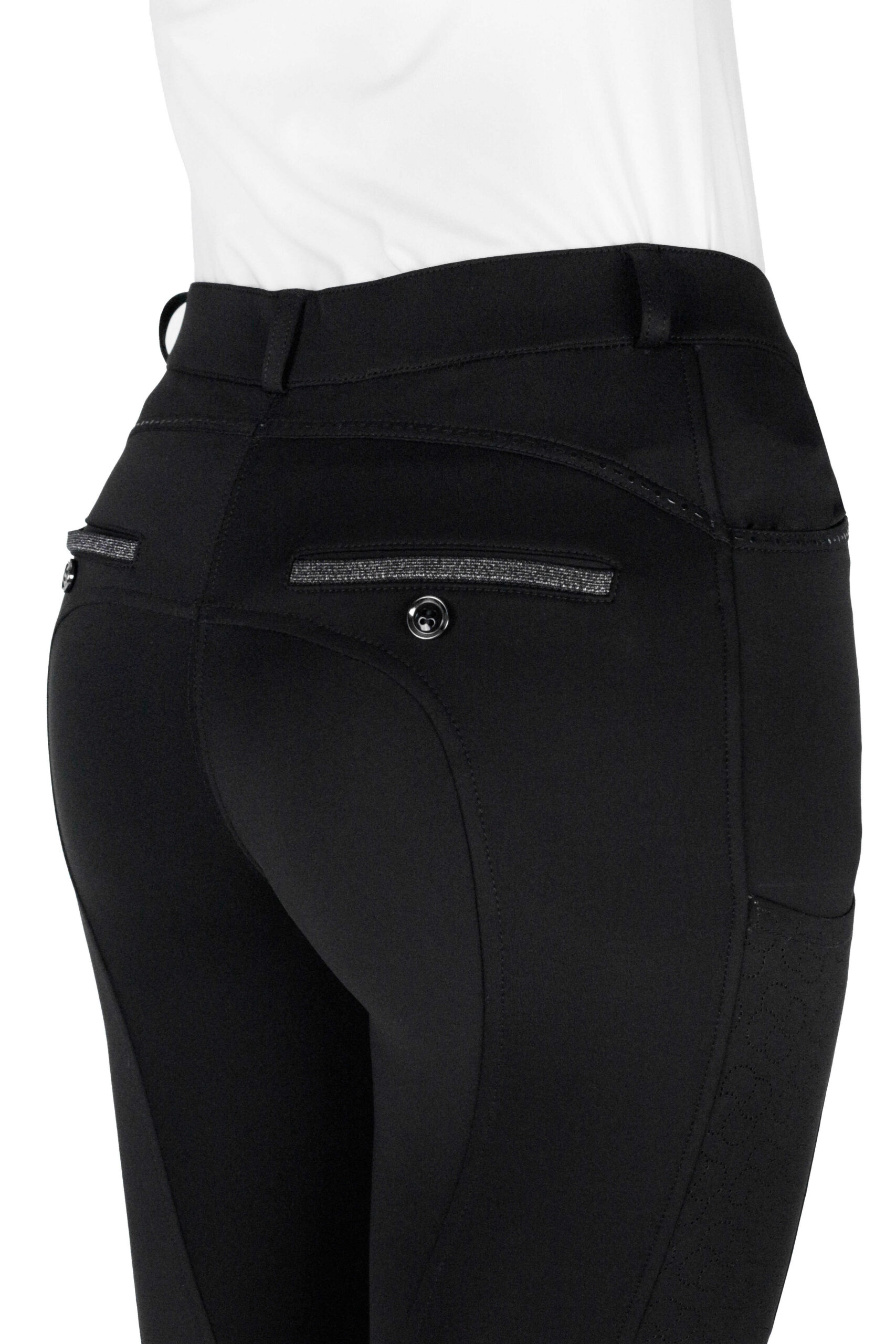 Breeches that offers comfort and style in the saddle.- Adjustment: Front closure with zip and button, with belt loops. – Stability in the saddle: Silicone knee patches for better grip. – Stretchy, breathable fabric with quick-drying properties. DETAILS: – Hand pockets and side pockets. – Fitted cut. – Decorative lurex stripe, decorative back flaps, and tonal Equithème silicone branding on the side. COMPOSITION: Main fabric: 87% polyester, 13% elastane.