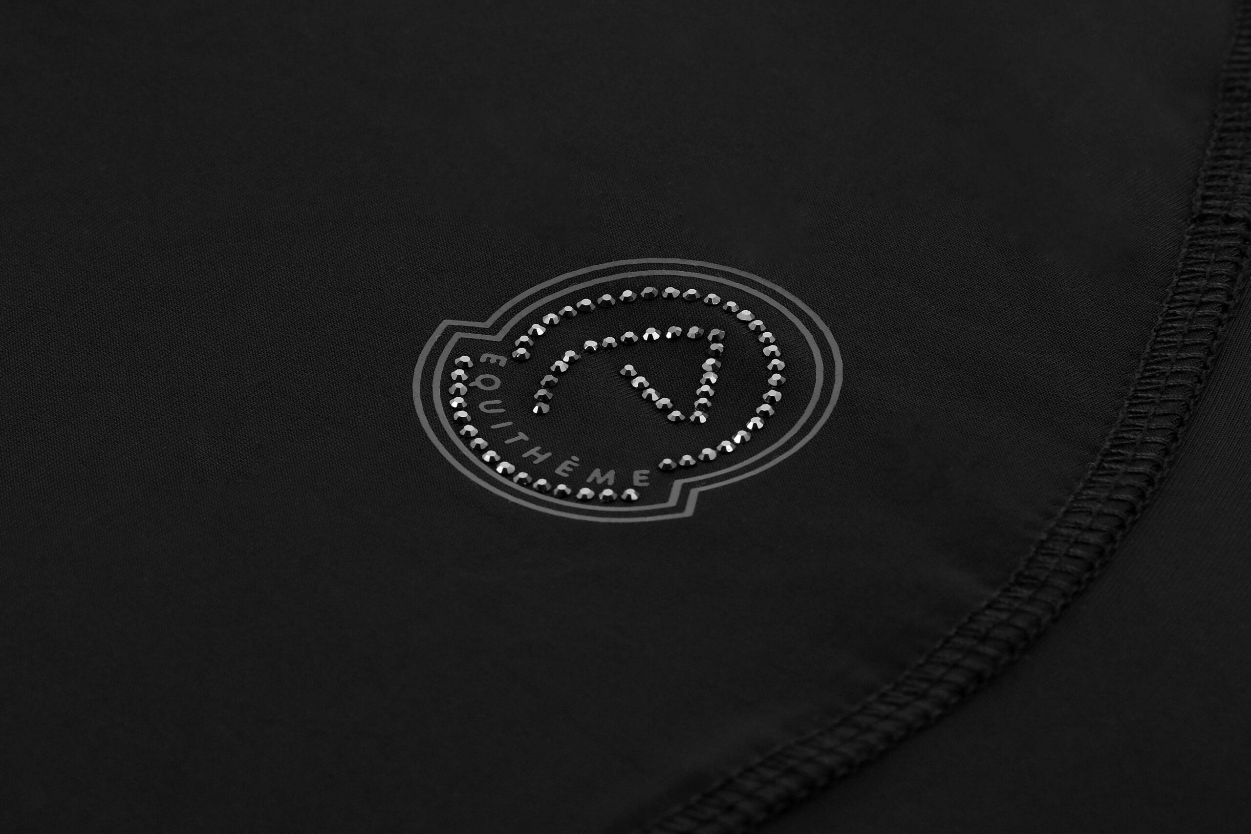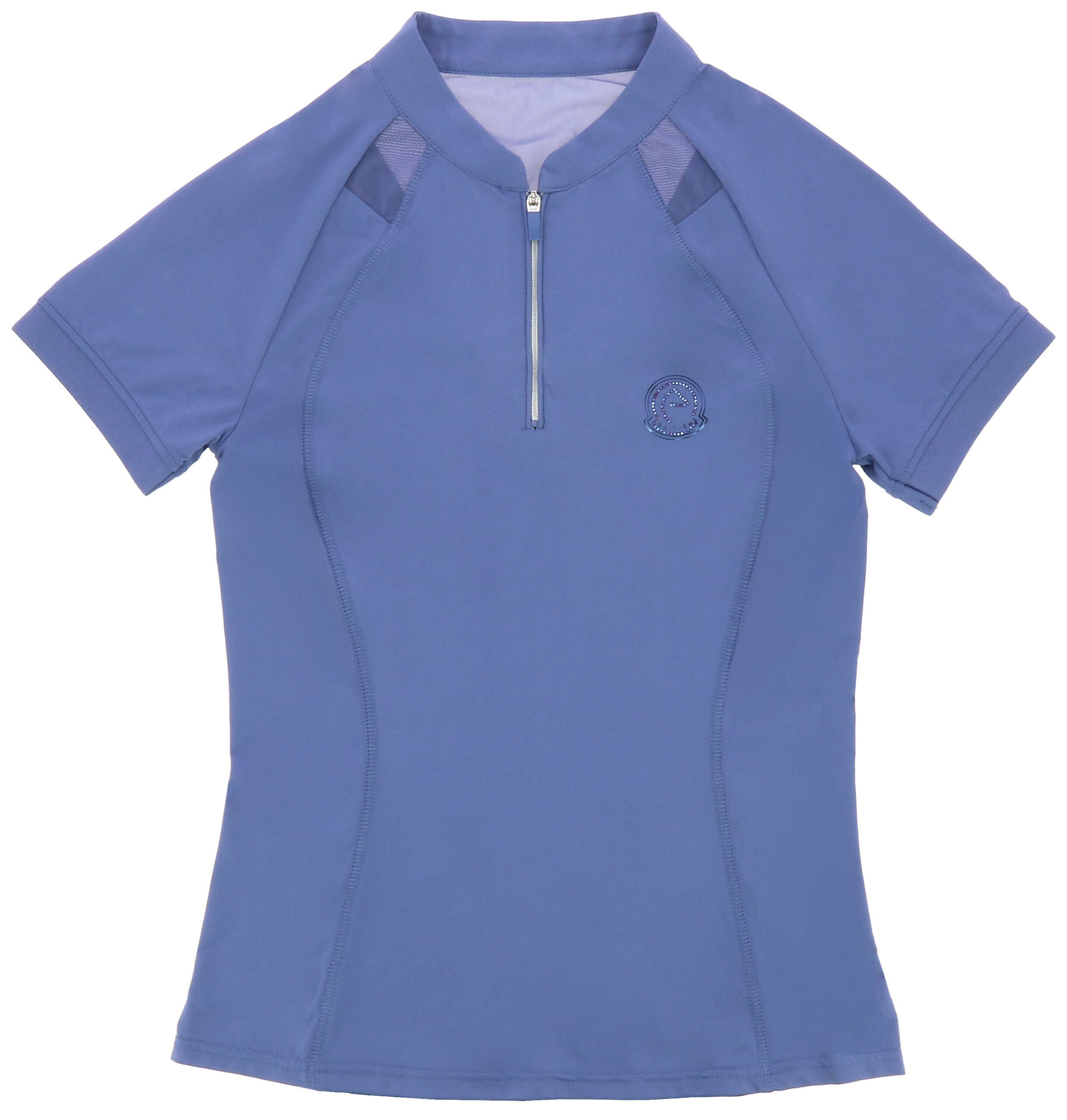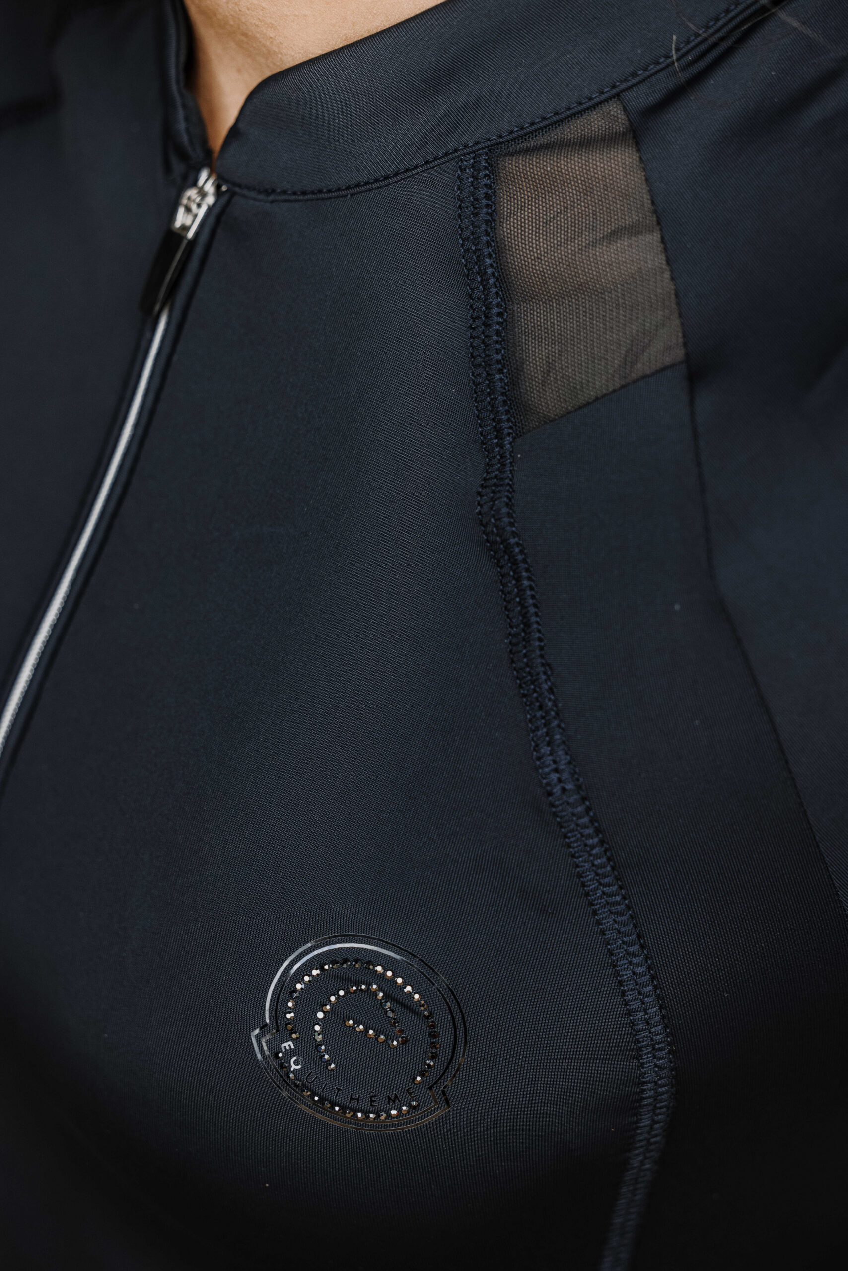 – Zippered collar opening, snug fit, contrasting decorative piping, and rhinestone logo.