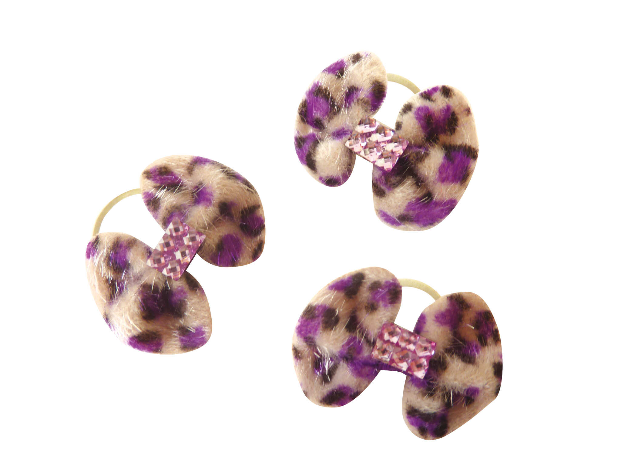Made of colorful 100% polyester fabric with a velour look and leopard print. A rhinestone-embellished barrette in the center is attached to an elastic band.