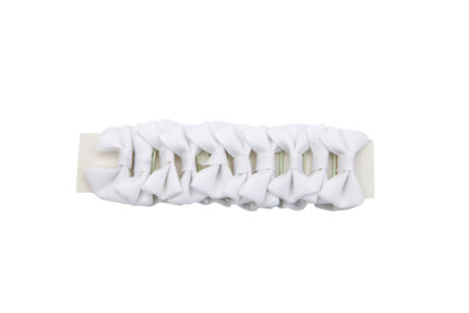 – Elastic band with bow made of glittery polyester fabric and rhinestones.