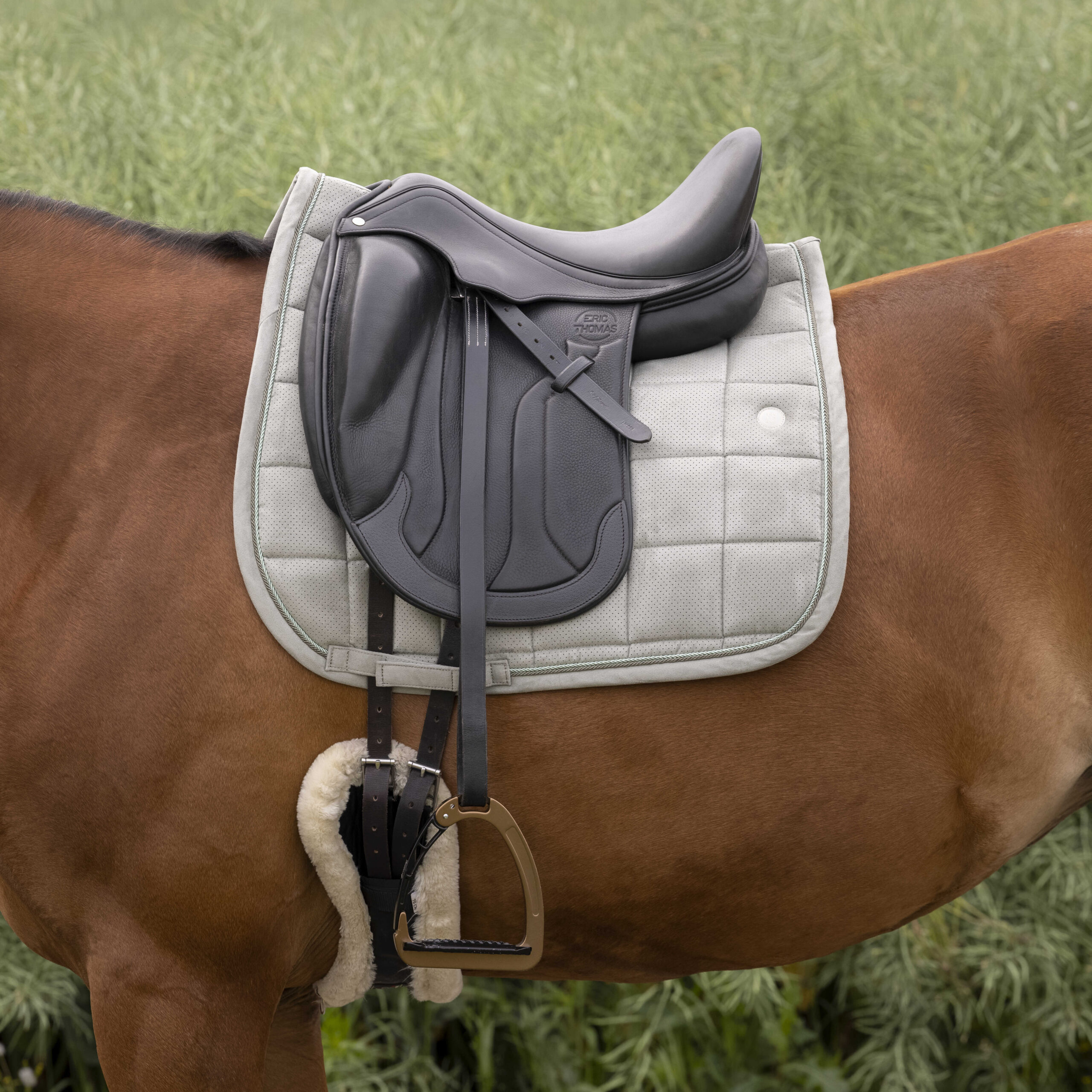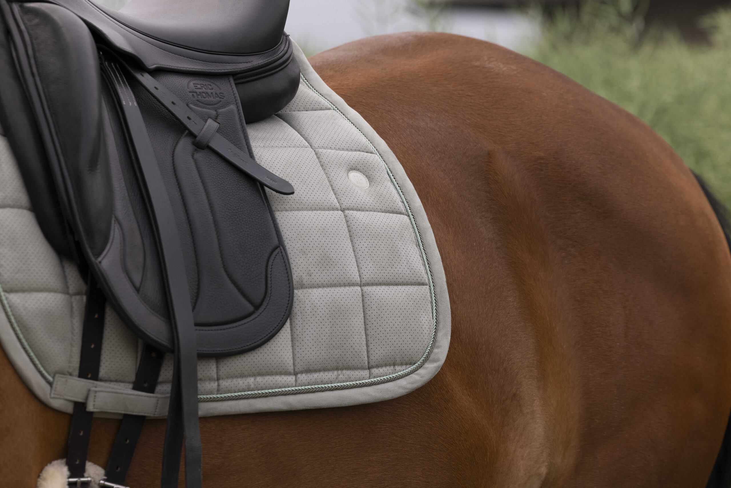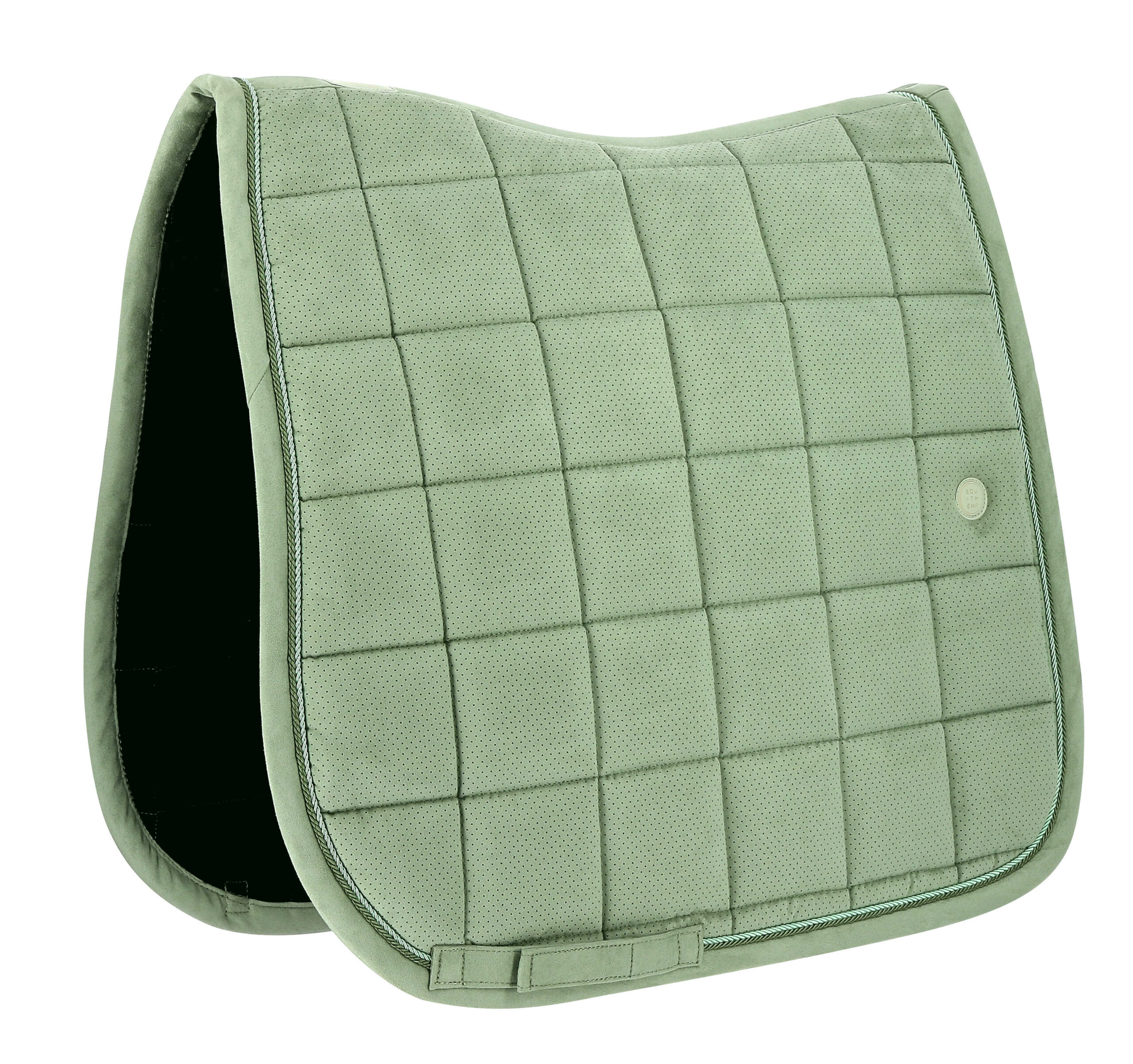 Saddle pad with a “peach skin” effect and laser-cut dot motif. 240 g/m² polyfill padding and 5 mm foam. Square cutouts. Decorative double braid. Girth loops. Material composition: 100% polyester exterior, polyester mesh lining, polyfill and foam padding.