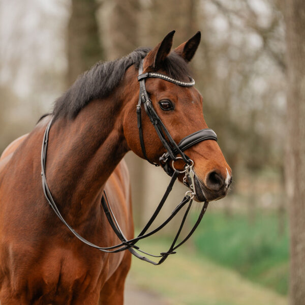 Buffalo leather bridle with soft Clarino lining under the headpiece and noseband. V-shaped browband decorated with black and clear rhinestones. Curb and snaffle cheek pieces with hook closures at the bottom. Black stitching, stainless steel buckles. Reins not included.