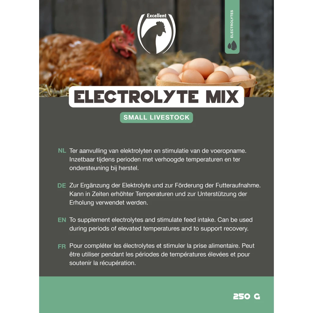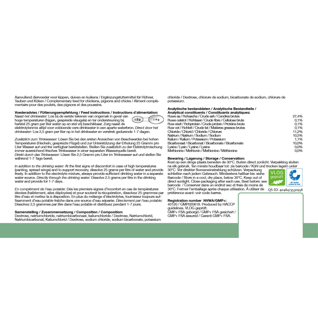 At the first signs of discomfort in case of high temperatures (panting, spread wings) and to support recovery, dissolve 25 g per litre of water and provide freely. In addition to the electrolyte mixture, always provide sufficient drinking water in a separate water source.
