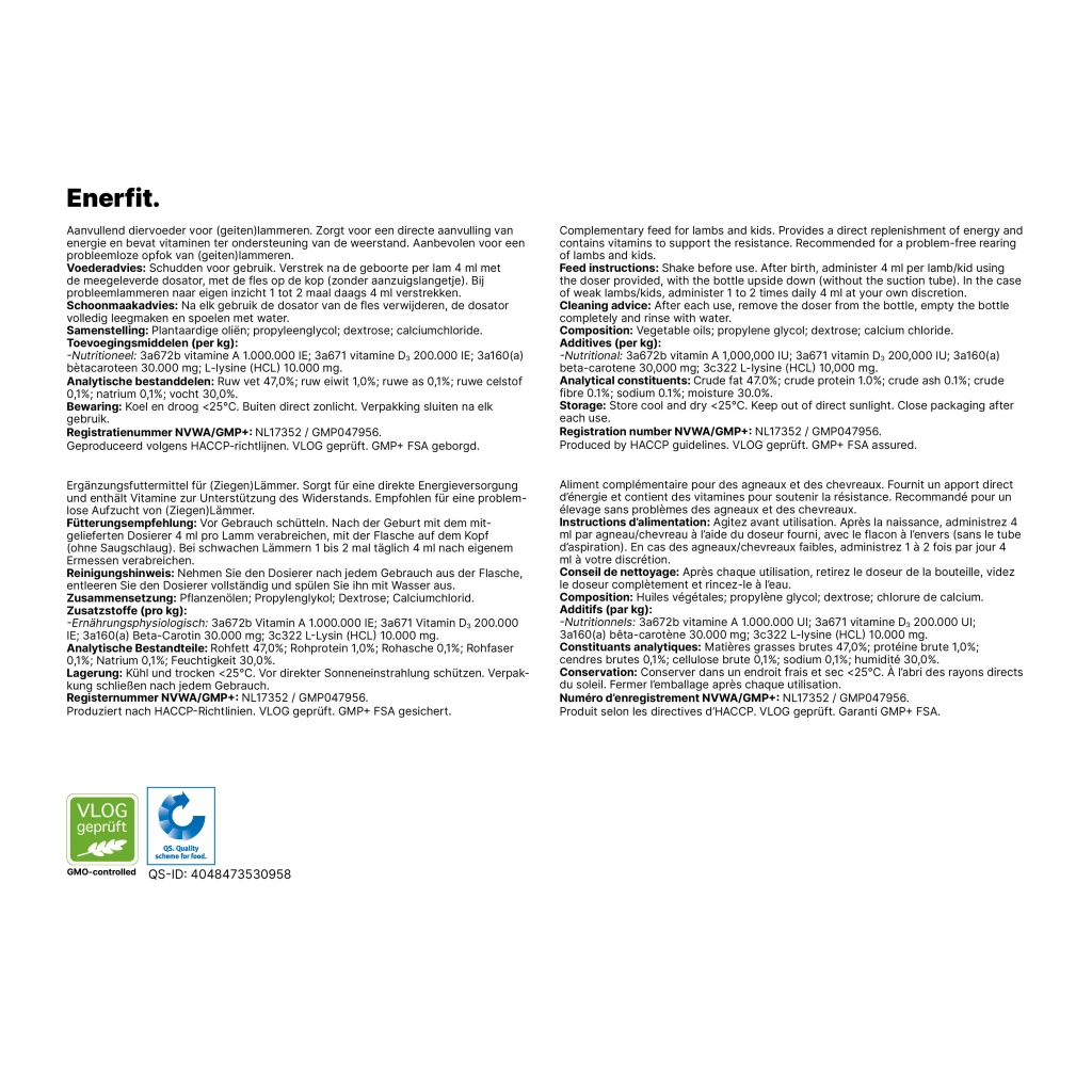 Enerfit quick start lamb provides a direct complement of energy so that weak lambs quickly feel fit again. The vitamins provide the necessary resistance, which is especially important to weak lambs and goat lambs.
