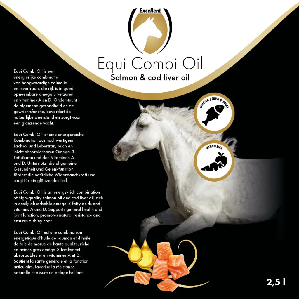 Excellent Horse Combi Oil is a feed for horses in liquid form. It supports general health and joint function, promotes natural resistance and ensures a shiny coat.