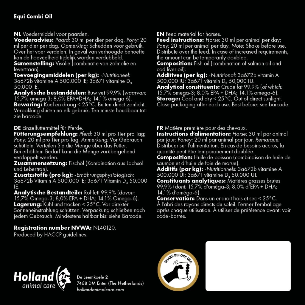 Combi Oil contains an energy-rich combination of fish oil, namely salmon oil and cod liver oil. Salmon oil is naturally rich in the essential fatty acids omega 3 and omega 6. Omega 3 fatty acids support the immune system, joints, skin, heart and blood vessels. Omega 6 fatty acids stimulate the immune system. Cod liver oil is also rich in omega 3 fatty acids and vitamins A and D. Vitamin A supports the immune system and vitamin D supports the bones and the absorption of calcium and phosphorus.
