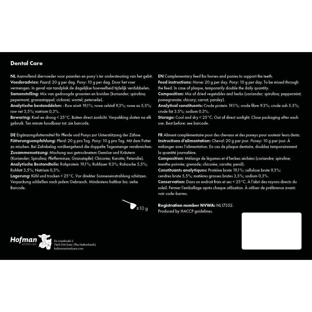 Maintaining healthy teeth is of vital importance for a healthy horse. Maintenance and dental care is therefore essential. Equi Dental Care is a complementary feed for horses ad ponies to support the teeth and is composed of a balanced mix of dried vegetables and herbs. It improves the condition of the gums, supports the reduction of tartar build-up and ensures fresh breath.