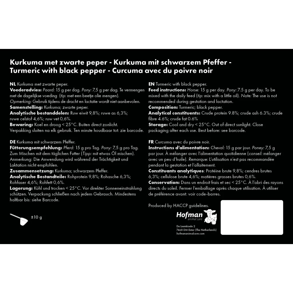 Consists of turmeric with black pepper and is a complementary feed for horses.