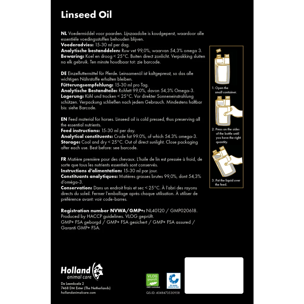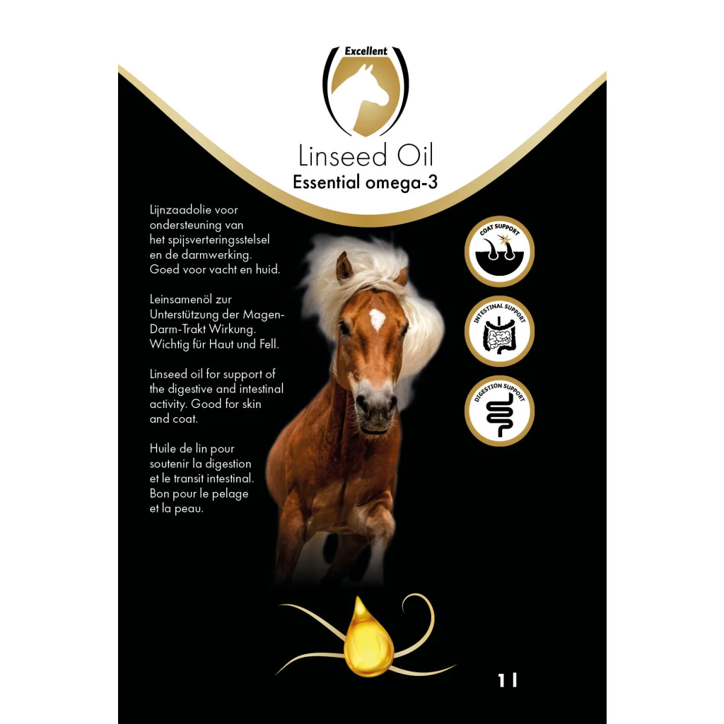 Linseed oil (Flaxseed oil) is a commonly used feed material by horse owners because of the high level of omega-3 fatty acids it contains. These fatty acids are essential for maintaining healthy skin and supporting the immune system in horses. In addition, linseed oil contributes to a shiny coat. This product is 100% cold-pressed linseed, leaving all natural active ingredients intact.