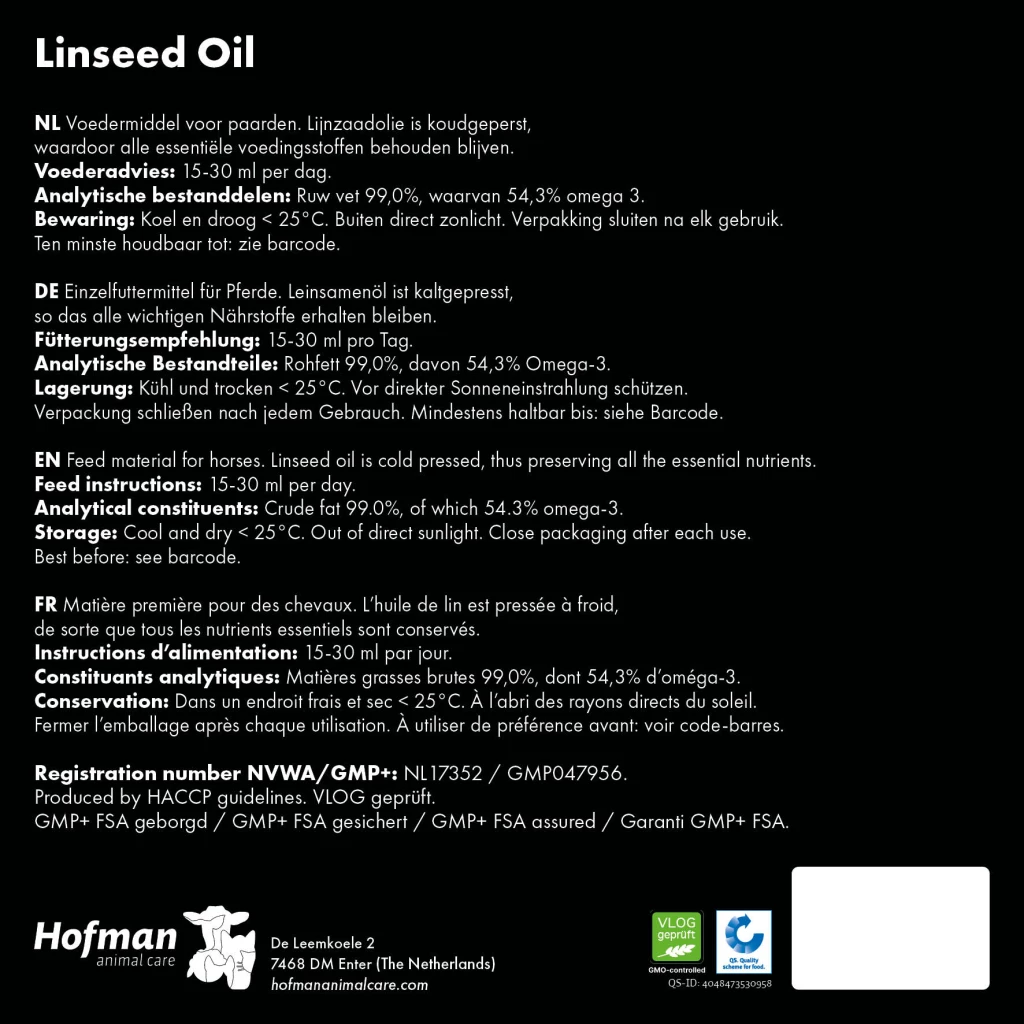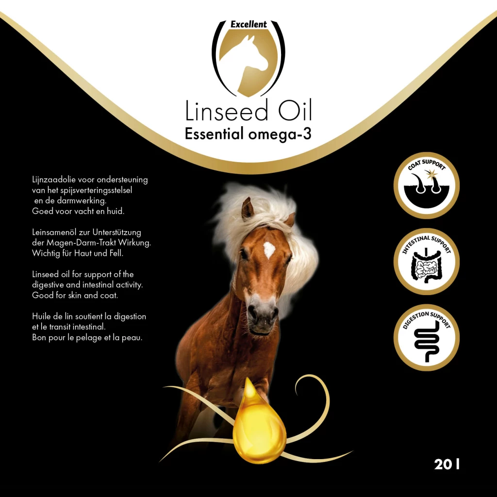 Linseed oil (Flaxseed oil) is a commonly used feed material by horse owners because of the high level of omega-3 fatty acids it contains. These fatty acids are essential for maintaining healthy skin and supporting the immune system in horses. In addition, linseed oil contributes to a shiny coat. This product is 100% cold-pressed linseed, leaving all natural active ingredients intact.