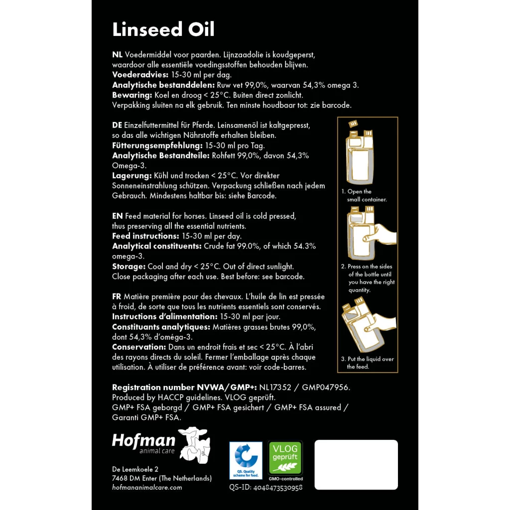 Linseed oil (Flaxseed oil) is a commonly used feed material by horse owners because of the high level of omega-3 fatty acids it contains. These fatty acids are essential for maintaining healthy skin and supporting the immune system in horses. In addition, linseed oil contributes to a shiny coat. This product is 100% cold-pressed linseed, leaving all natural active ingredients intact.