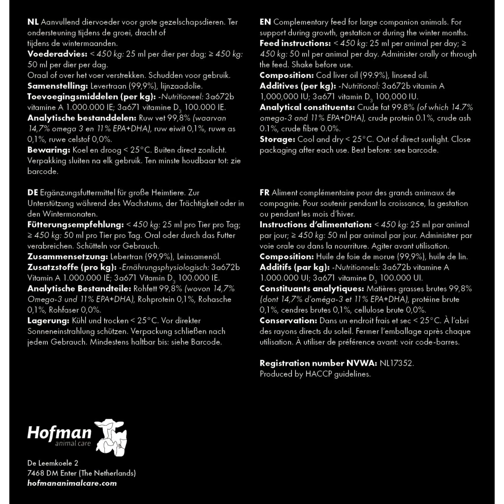 Liver Oil is a valuable addition to the diet of young animals and for pregnant animals in the phase of gestation or during the winter months.