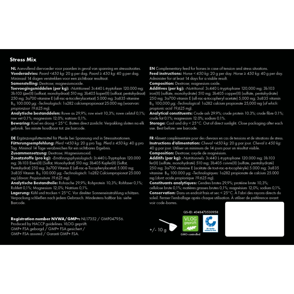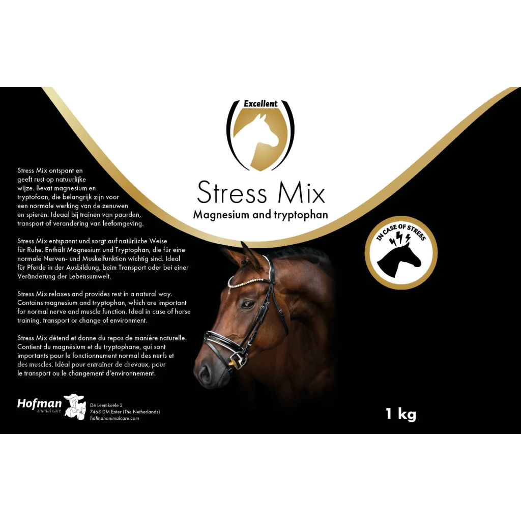 No Stress Mix on looduslik tรคiendsรถรถt, mis pรตhineb aminohappel L-trรผptofaanil, suurel magneesiumisisaldusel ning lisatud vitamiinidel ja mineraalidel. L-trรผptofaan ja magneesium on olulised nรคrvi- ja lihaste normaalseks talitluseks. Toode aitab hobusel lรตรตgastuda ja rahuneda loomulikul viisil, toetades samal ajal parimat sooritusvรตimet.