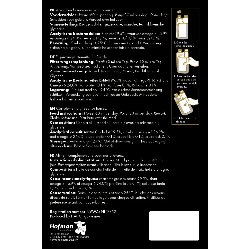 Equi Omega Boost is a complementary vegan feed for horses and consists of a mix of vegetable oils. These oils, which are rich in omega 3 and omega 6 fatty acids, have been specially selected to support the maintenance of healthy skin and restore shine to the coat. Omega 3 and omega 6 fatty acids are polyunsaturated fatty acids, which the body needs to function normally, but which the horse cannot produce itself. That is why these fatty acids have to be ingested through the feed. Due to its liquid form, Equi Omega Boost is easy to absorb and you will see the difference quickly!