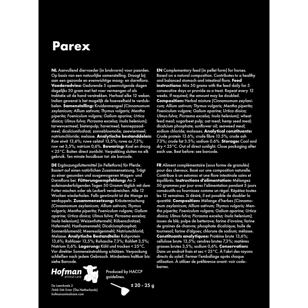 Equi Parex 5 x 50 g (EQUI00001CG) is a ready made packaging. It contains 5 easy sacks of 50 g. Easy to use and to administer during 5 days.