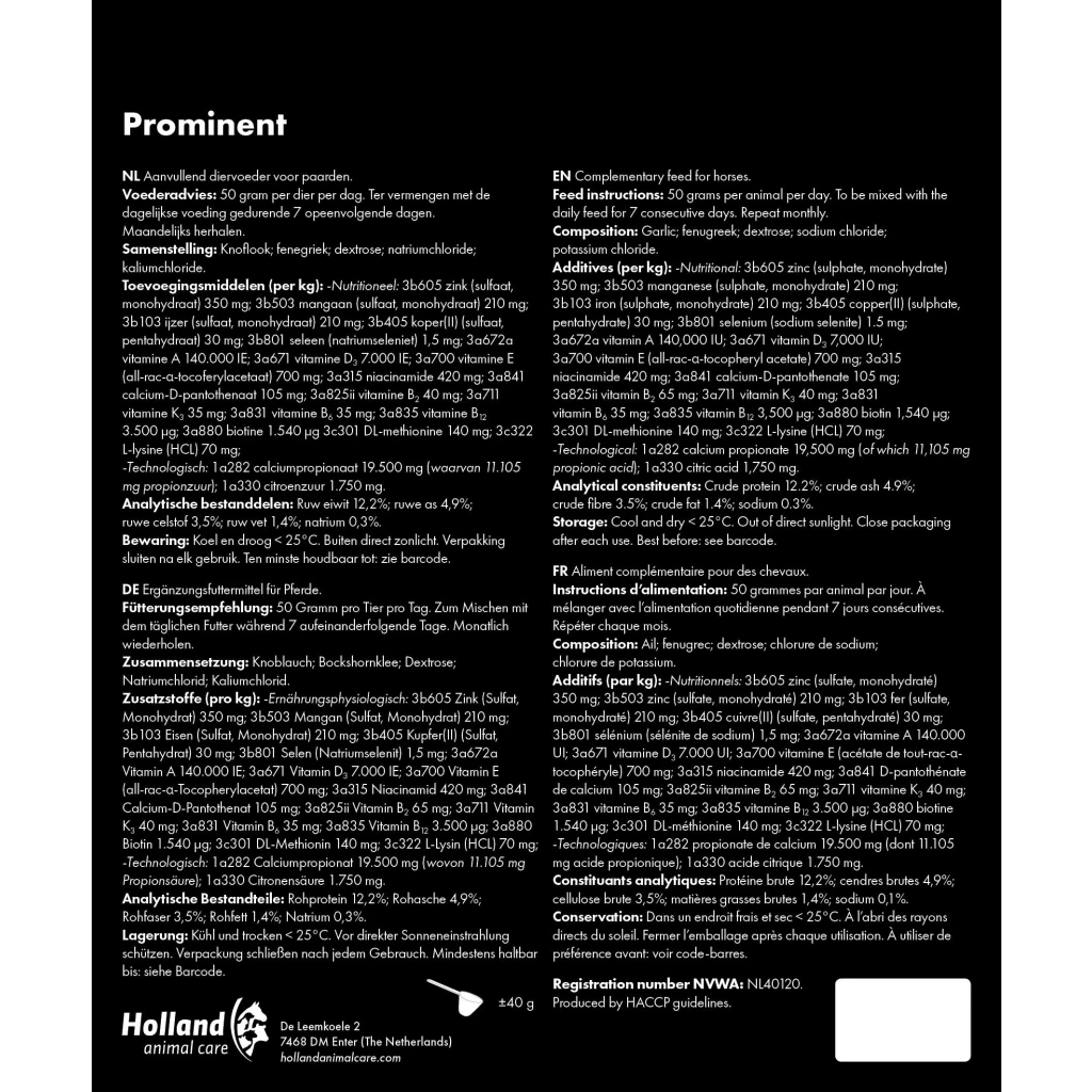 It also improves hoof condition and provides a healthy shiny coat. Prominent contains a well-balanced blend of minerals and vitamins, with special addition of garlic, fenugreek and biotin. By giving your horse Prominent for 7 consecutive days every month, the horse’s immune system will improve immensely.