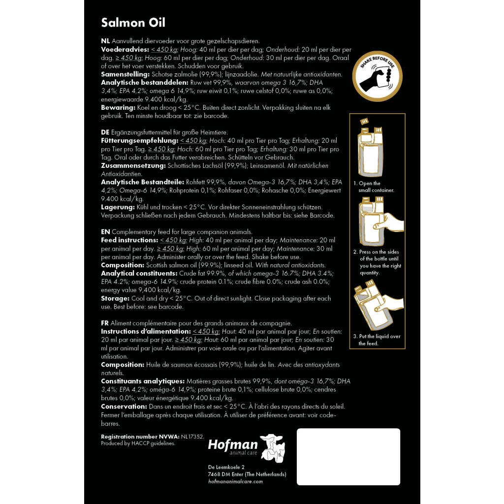 Rich in omega 3 (EPA & DHA) and 6 fatty acids. This complementary feed supports general health, promotes the natural immune system and supports joint function. In addition, Salmon Oil has a beneficial effect on the heart, stimulates the appetite and provides more energy.