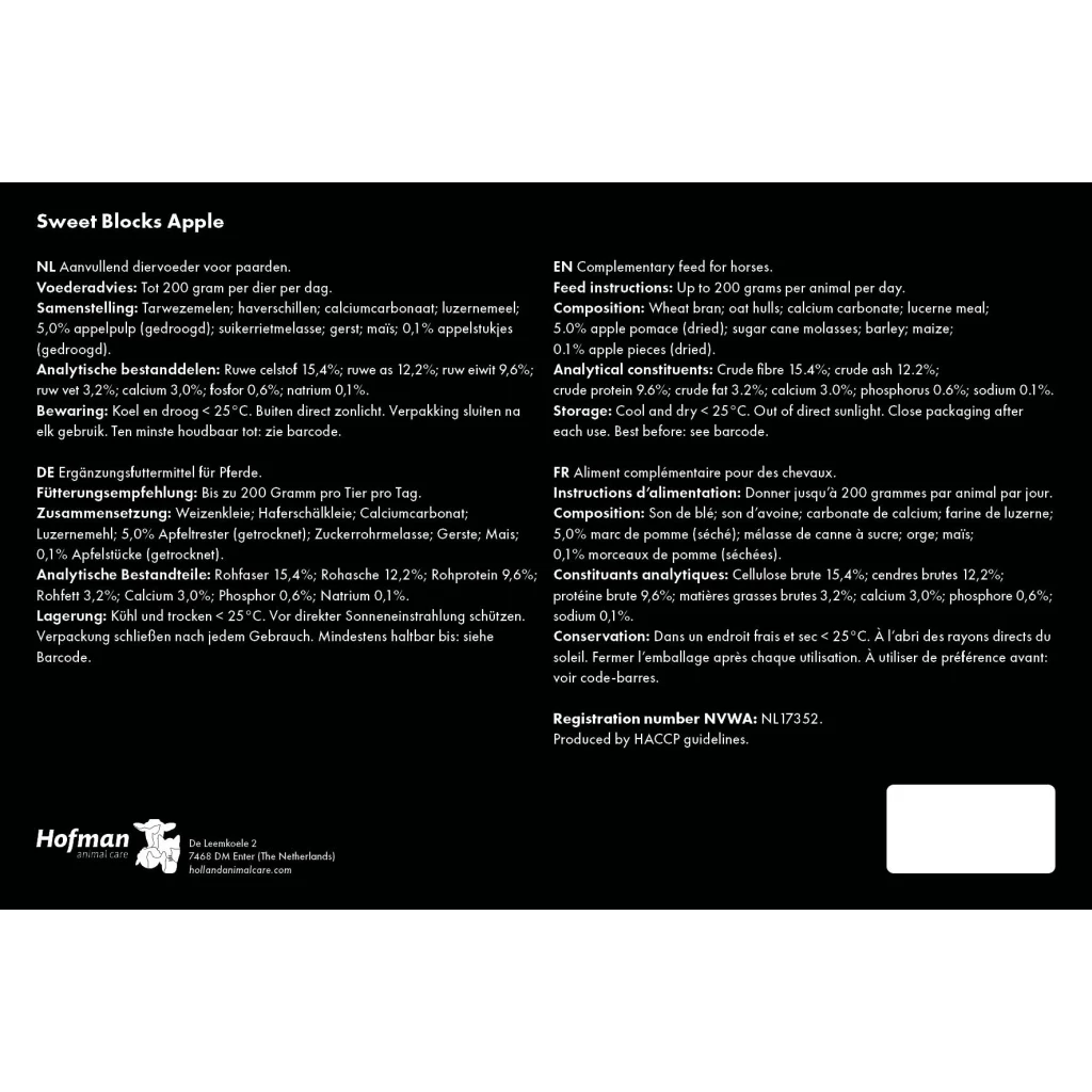 The base of the Sweet Blocks includes wheat bran, oat hulls and barley, grains used in many horse feeds. In addition, these treats contain sugar beet molasses and, depending on the variant chosen, dried apple pomace and apple pieces, dried bananas, dried carrots, garlic or herbs, for a delicious flavour.