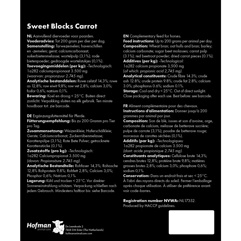 The base of the Sweet Blocks includes wheat bran, oat hulls and barley, grains used in many horse feeds. In addition, these treats contain sugar beet molasses and, depending on the variant chosen, dried apple pomace and apple pieces, dried bananas, dried carrots, garlic or herbs, for a delicious flavour.