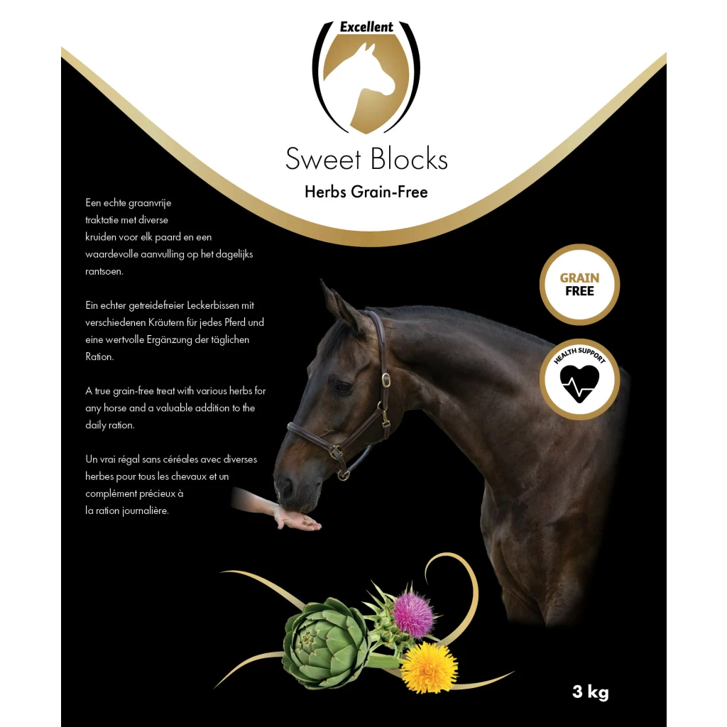 Excellent Horse Sweet Blocks Grain-Free are a grain-free and tasty treat for horses. They are the ideal, ‘non-fattening’ reward for horses while being a valuable addition to the daily ration and supporting the overall health of horses. The Sweet Blocks Grain-Free are easy to carry loose in your bag or pocket as they do not crumble or stick.