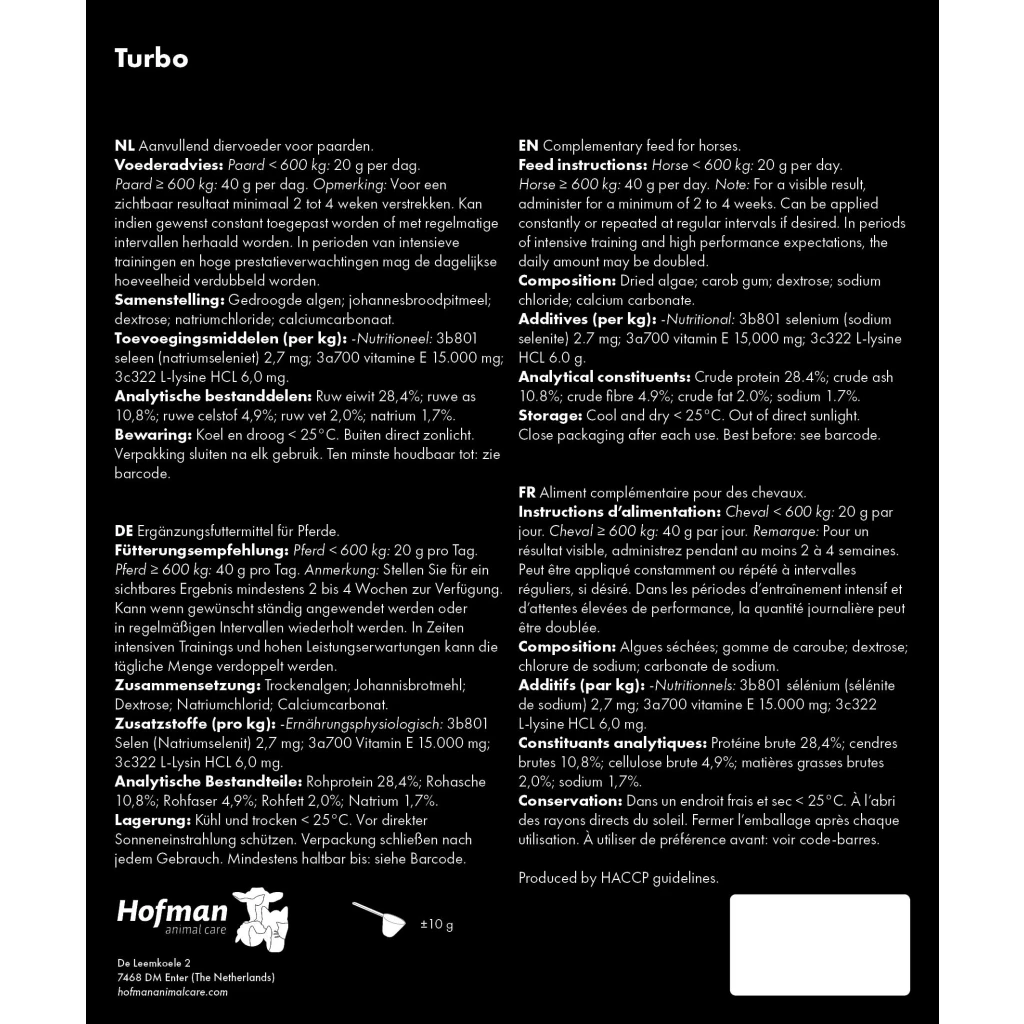 Equi Turbo can be constantly applied or at regular intervals. During periods of intensive training and high performance expectations, the daily quantity to be administered may be doubled.