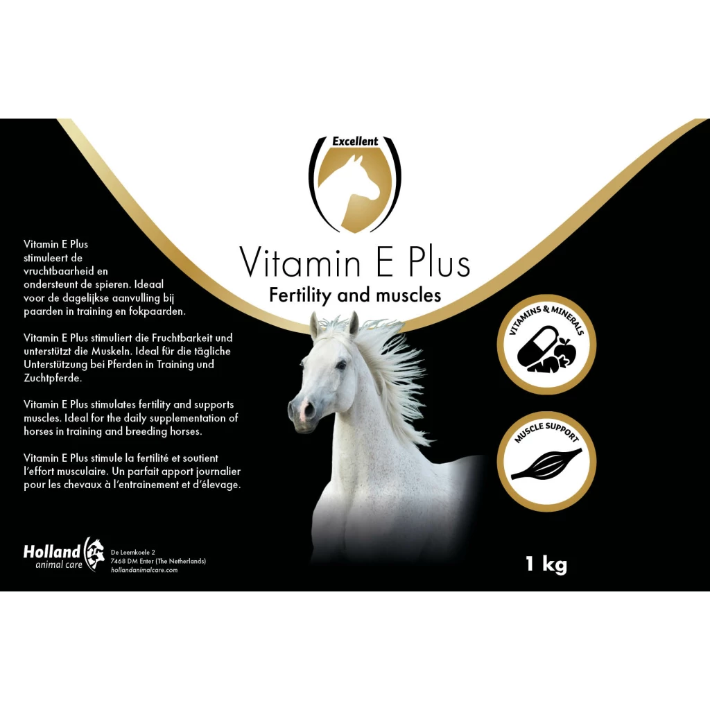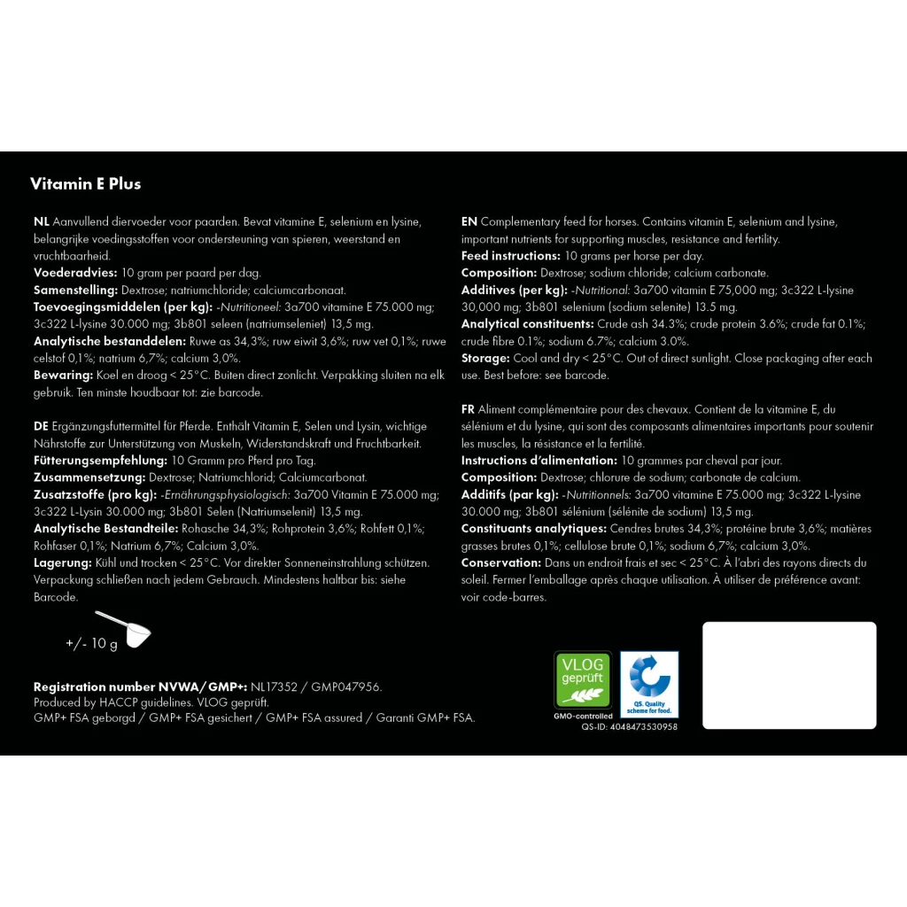Vitamin E Plus is a balanced plus supplement with vitamin E, selenium and lysine. These are important nutrients for the support of muscles, resistance and fertility.