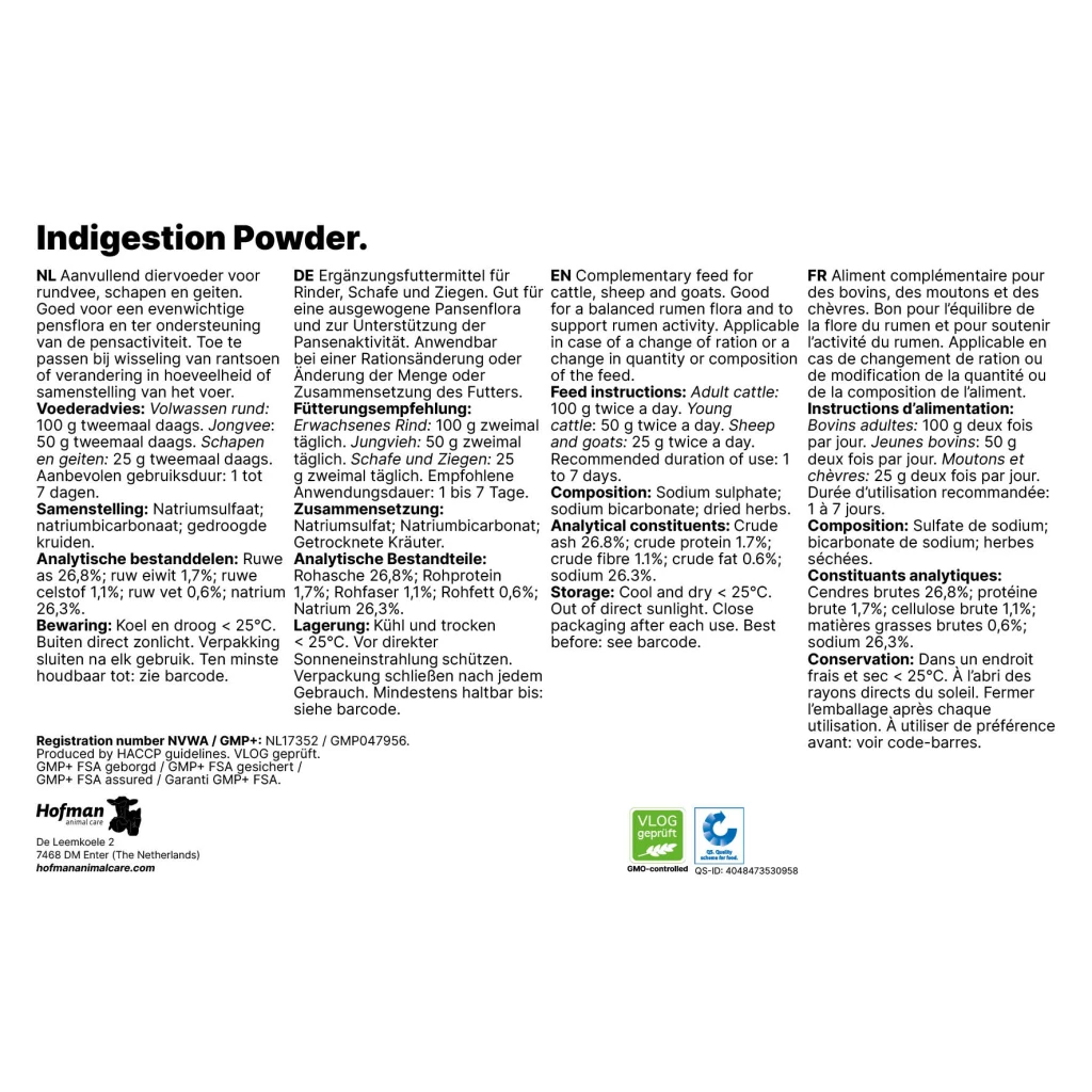Powder for adult cattle, young cattle, sheep and goats to stimulate rumen activity.