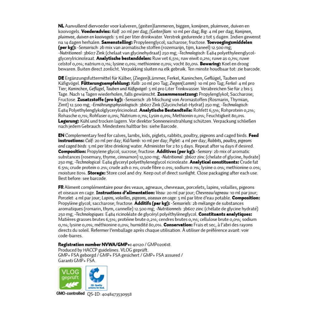 Complementary feed for calves, lambs, kids, piglets, rabbits and poultry to support the intestinal function and the resistance.