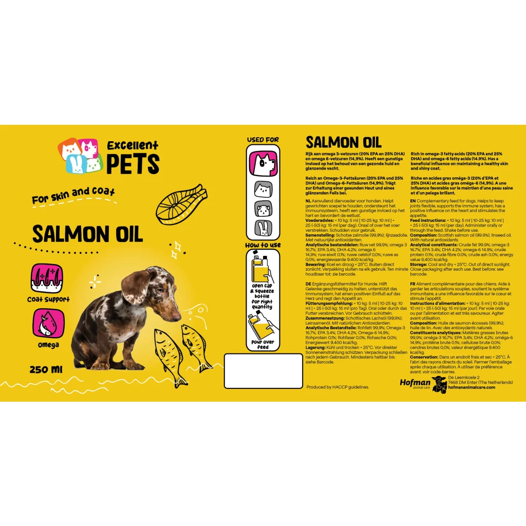 Excellent Pets Salmon Oil is a complementary feed for dogs in liquid form. It helps maintain supple joints, supports the immune system, has a beneficial effect on the heart and promotes appetite.