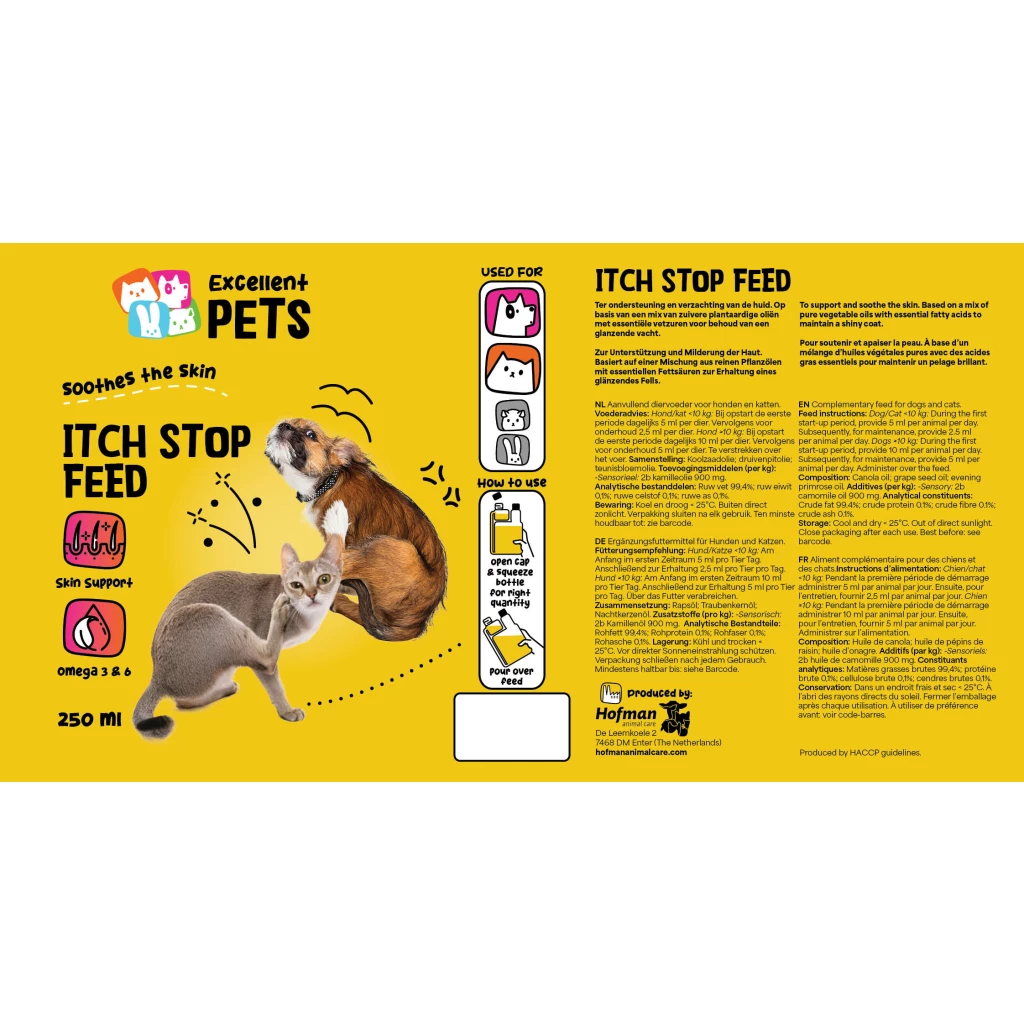 Excellent Pets Itch Stop Feed is a complementary feed for dogs and cats in liquid form. It supports and softens the skin and maintains a shiny coat.