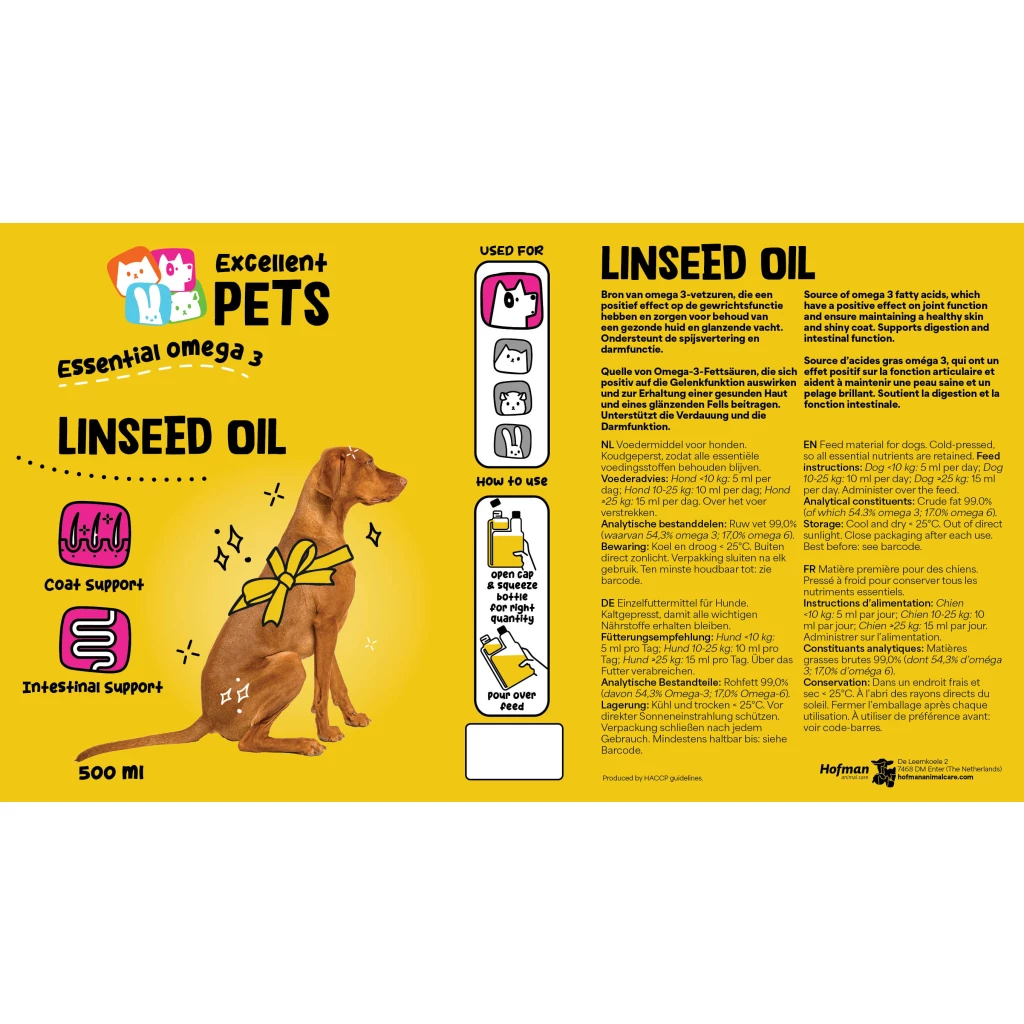Excellent Pets Linseed Oil is a feed for dogs in liquid form. It is good for joint function, supports digestion and bowel function, and supports the maintenance of healthy skin and shiny coat.