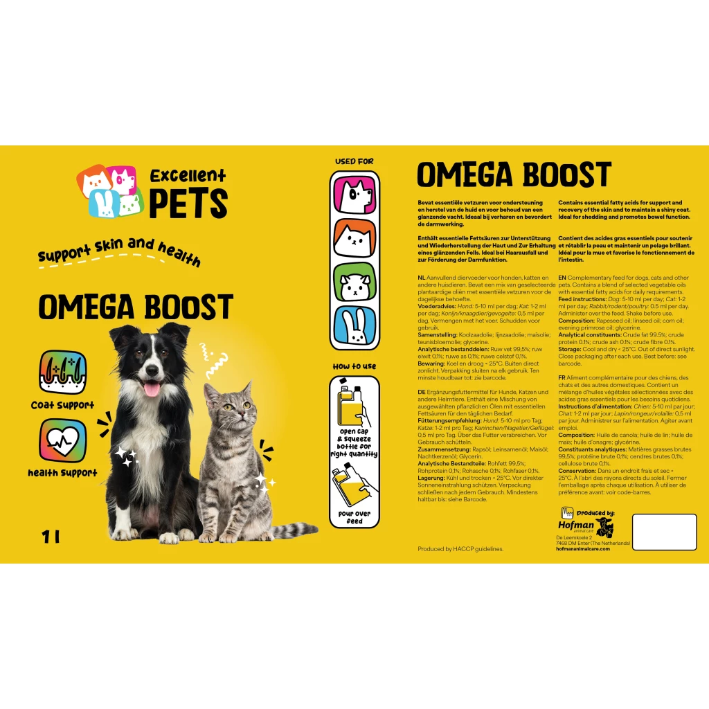 Excellent Pets Omega Boost includes a blend of vegetable oils such as rapeseed oil, linseed oil, corn oil and evening primrose oil. These oils are naturally rich in omega 6 and omega 3 fatty acids. Omega 6 fatty acids support the maintenance of healthy skin and shiny coat and boost the immune system, while omega 3 fatty acids support joints and bowel function.