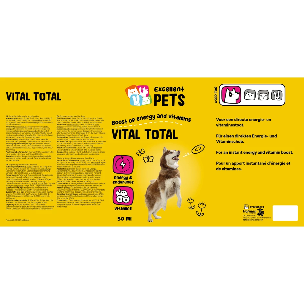 Excellent Pets Vital Total is a complementary feed for dogs in liquid form. It provides an immediate energy and vitamin boost.