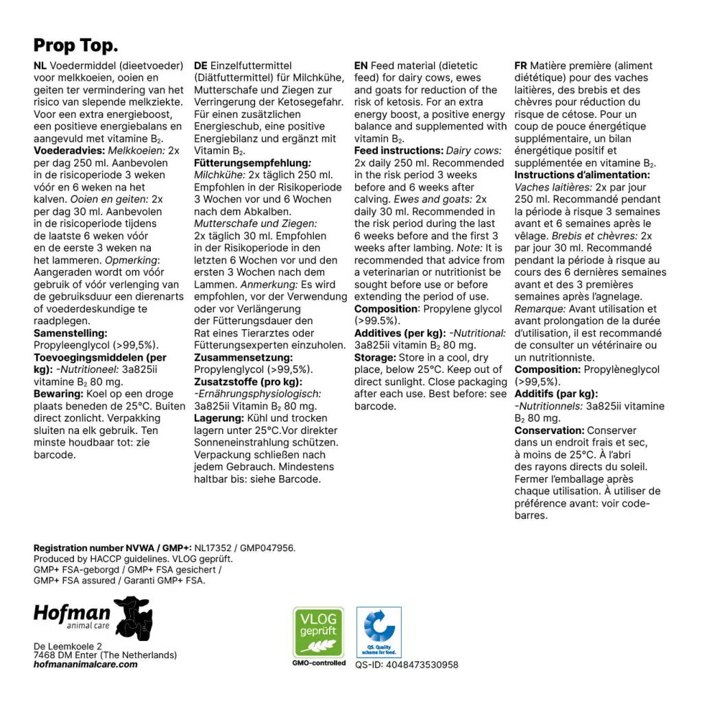 To reduce the risk of ketosis. As an extra energy booster in dairy cattle. To counteract the negative energy balance in dairy cattle. Can also be used in sheep and goats. Recommended to be used in the risk period of 3 weeks before and 6 weeks after calving / 6 weeks before to 3 weeks after lambing.