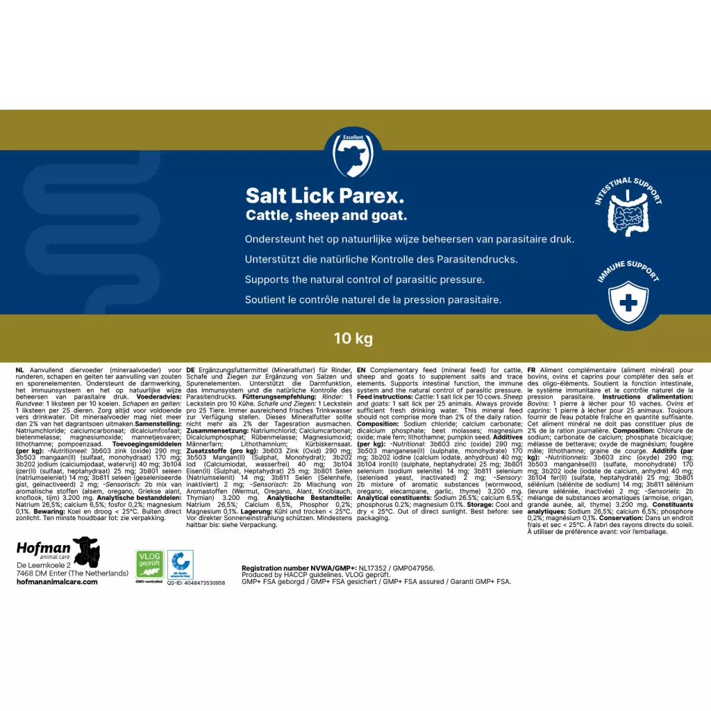 Excellent Salt Lick Parex is a complementary feed (mineral feed) for cattle, sheep and goats to supplement salts and trace elements. It supports intestinal function and the immune system. In addition, this salt lick supports the natural control of parasitic pressure.