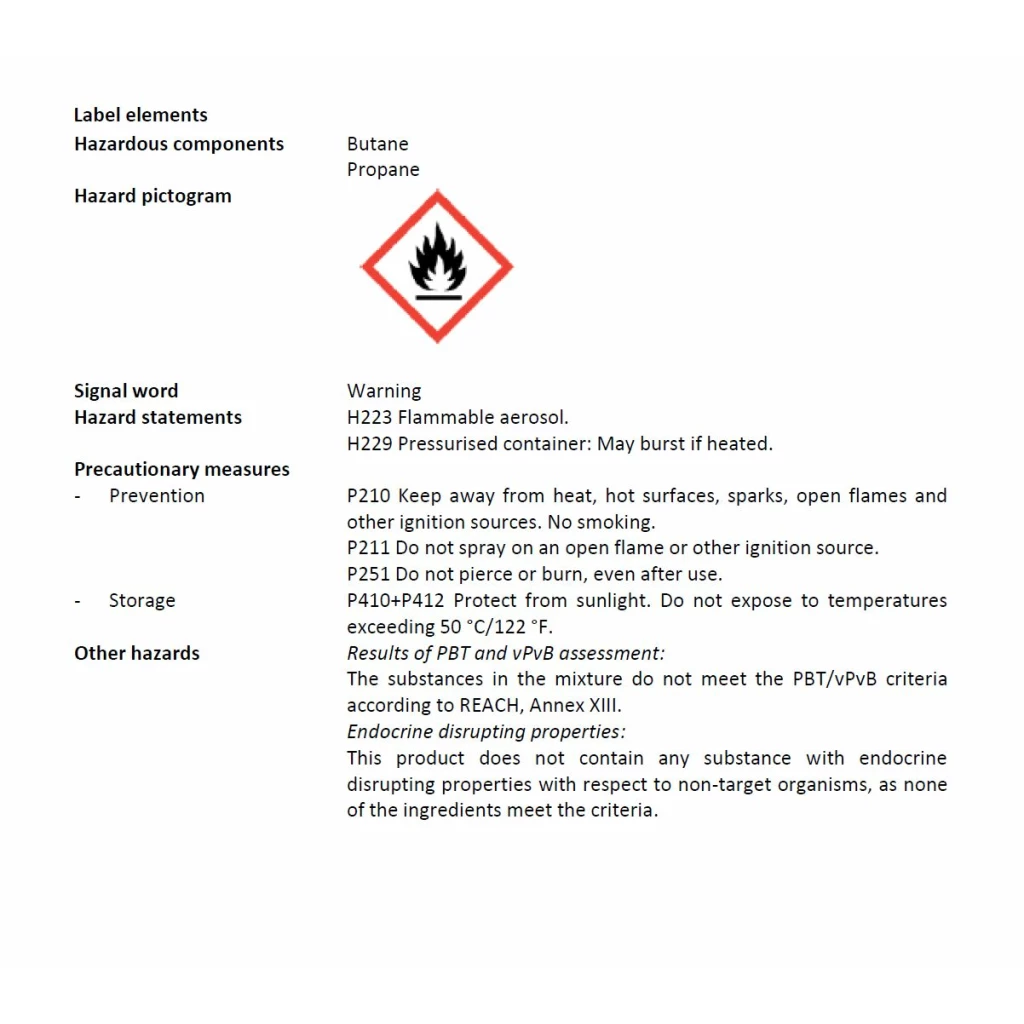Butane/propane, cod liver oil, polysorbate 20, myroxylon pereirae oil (peruba balsam), isopropyl alcohol, ricinus communis seed oil (castor), lanolin, silica.