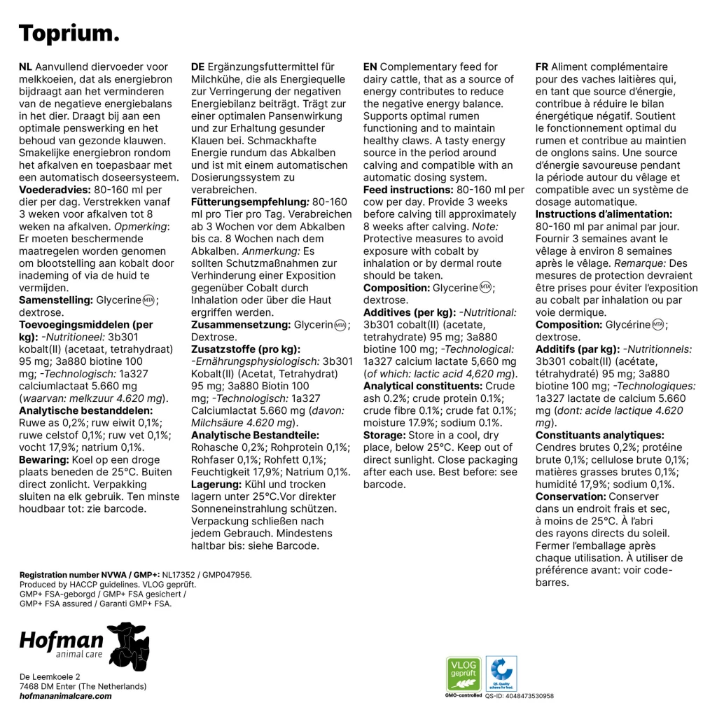 Toprium is cost reducing, super tasty and contributes to a healthy cow, optimum fertility, healthy claws and maximum energy supply. Can be administered with any dosing system directly over the feed or with a feed mixer.