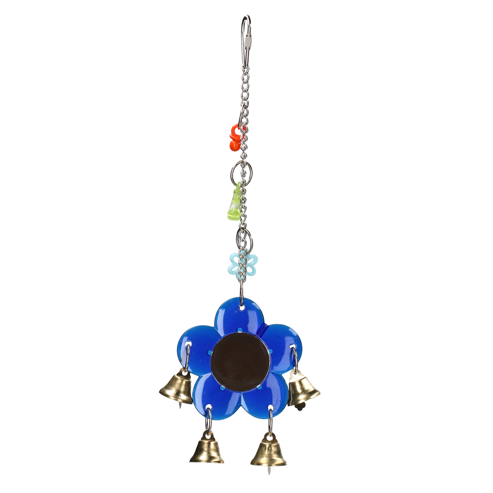 This toy for birds is equipped with 4 bells, and includes a number of plastic accessories on the chain.