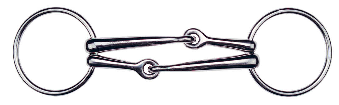 Stainless steel, double-jointed, recommended for horses with a hard mouth but not a pulling mouth. The asymmetrical joint has a good relaxing effect.