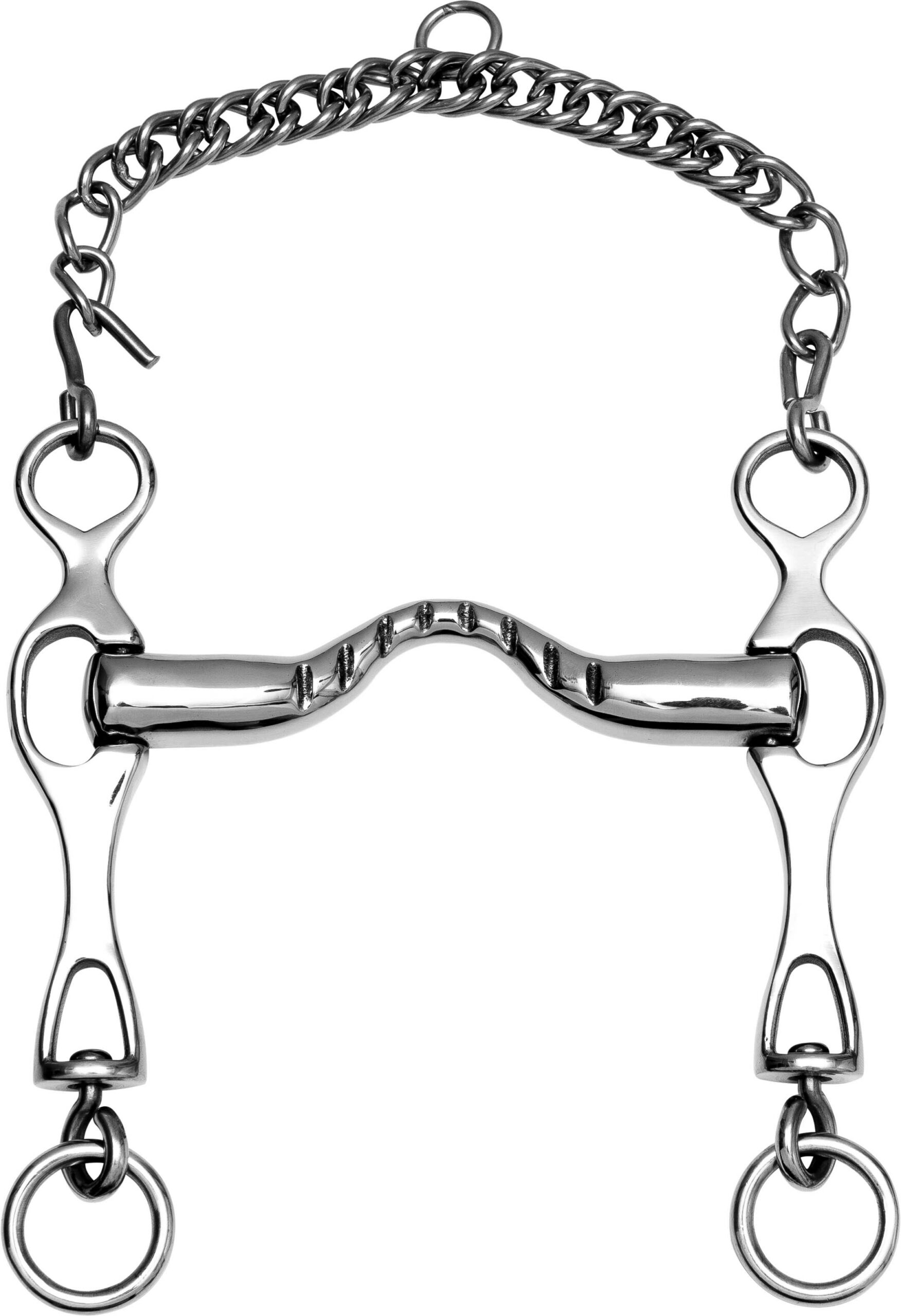 Stainless steel with tongue opening and chin chain.