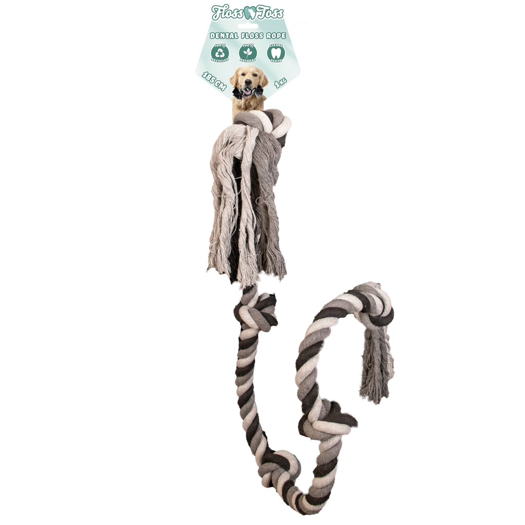 This amazing Floss Dental Rope floss rope is made of 100% natural cotton, making it safe, durable, and environmentally friendly. It is specially designed for fetch and tug games with dogs. During play, the floss rope not only helps improve the health of your dog’s mouth, but also cleans their teeth and gums. This is due to the specially designed braiding technique used, where only whole threads are used, making the floss rope tighter braided and much stronger than regular floss ropes. Additionally, it is made from recycled material, so it’s not only good for your dog but also for the environment.