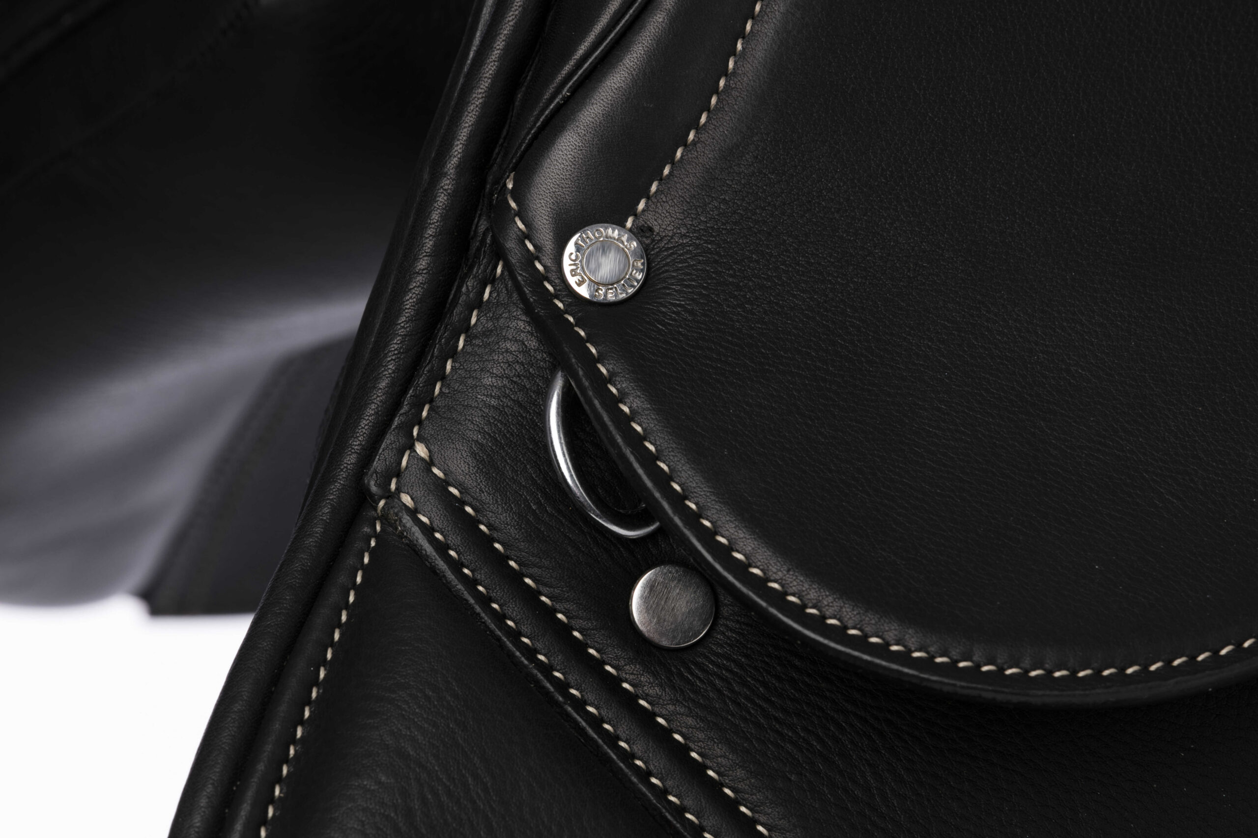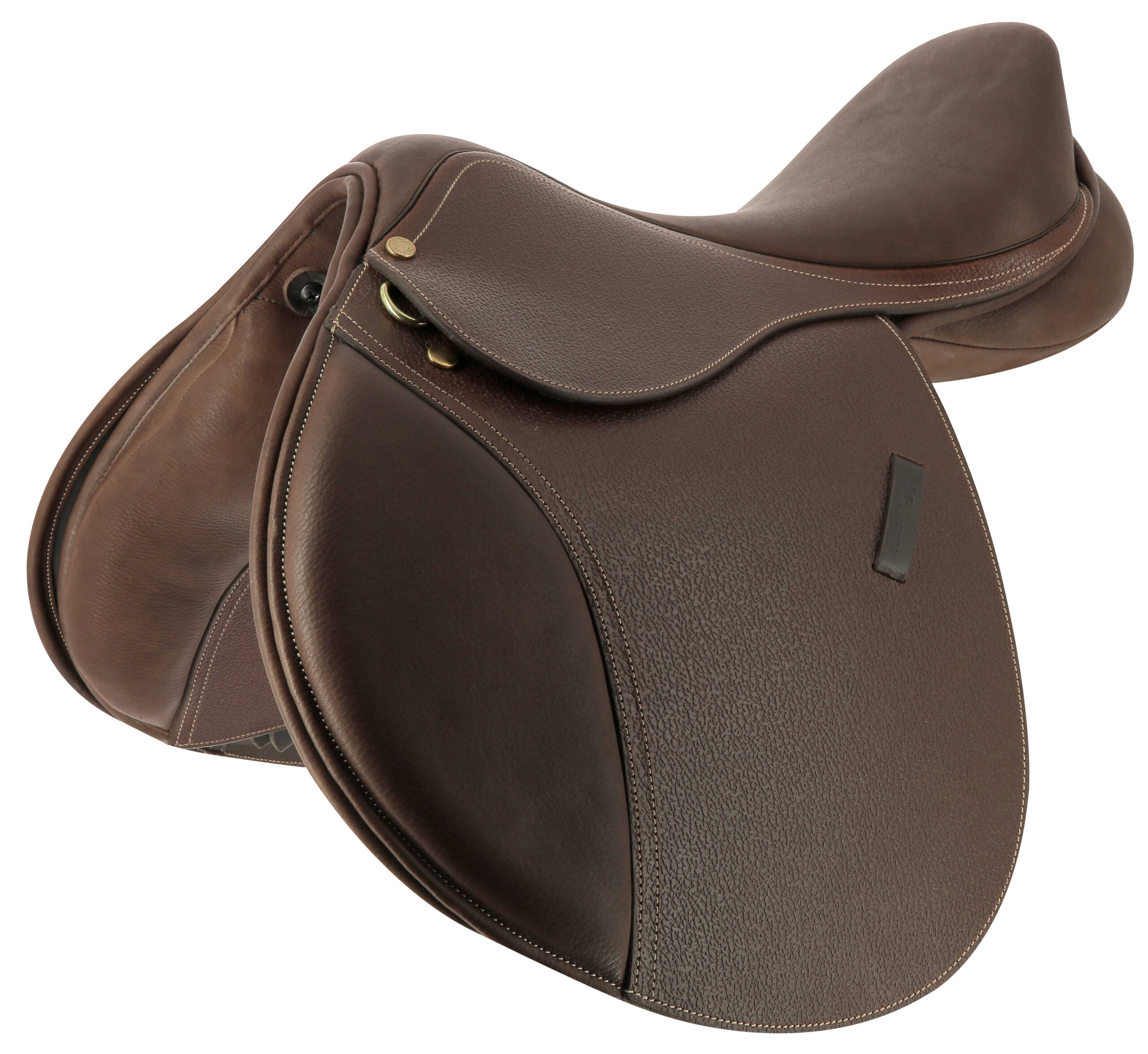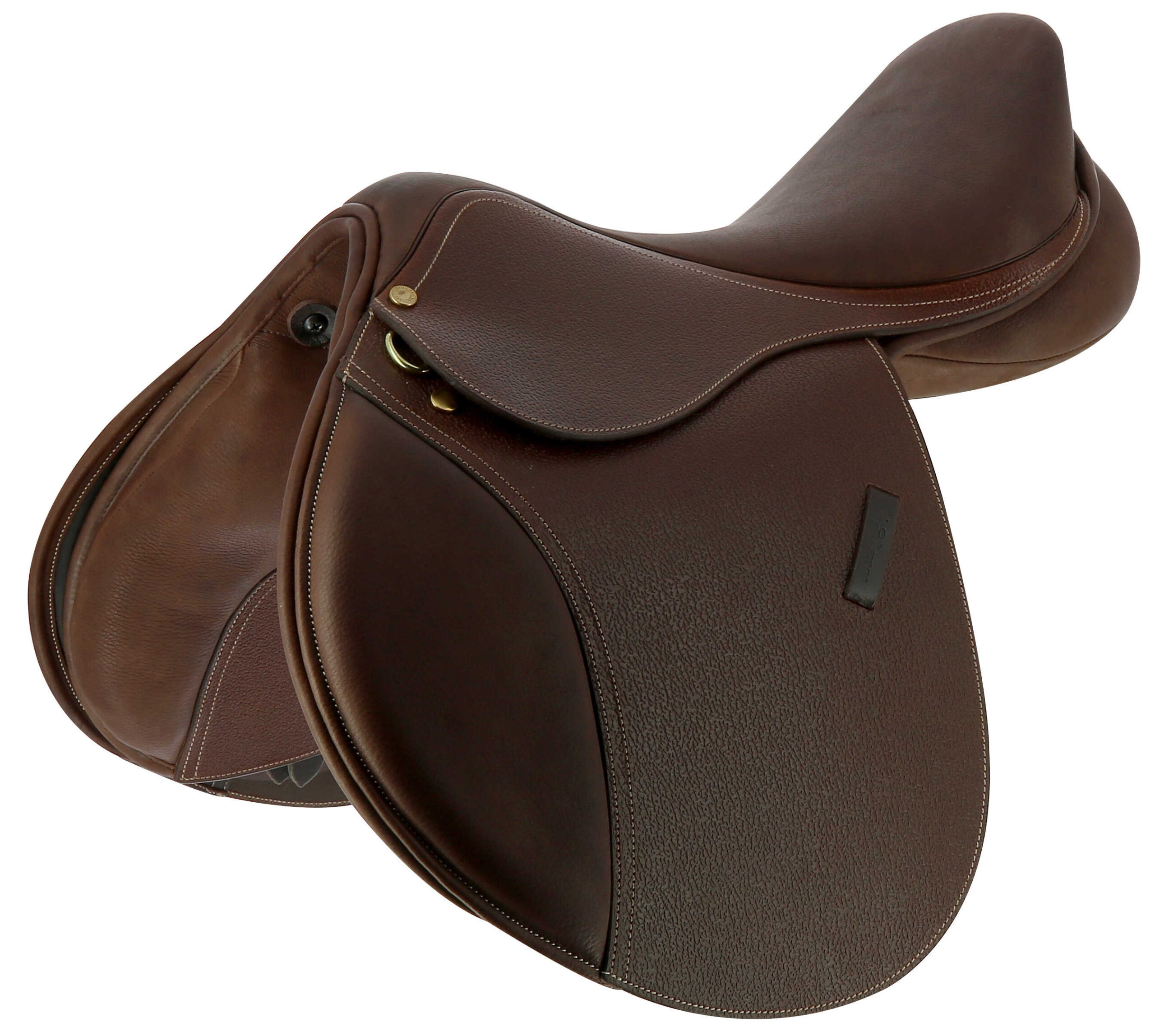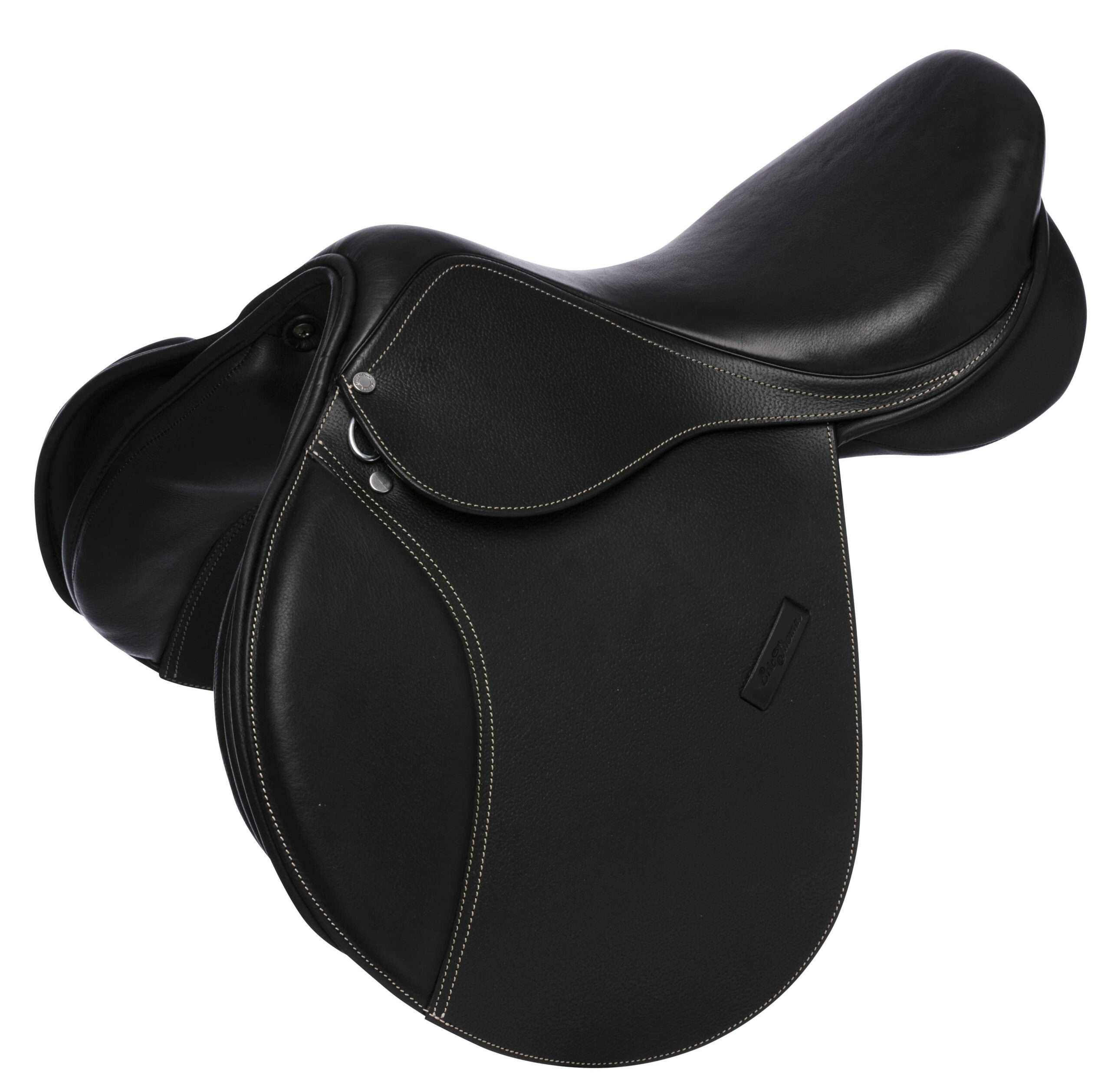 Jumping saddle with decorative contrast stitching.